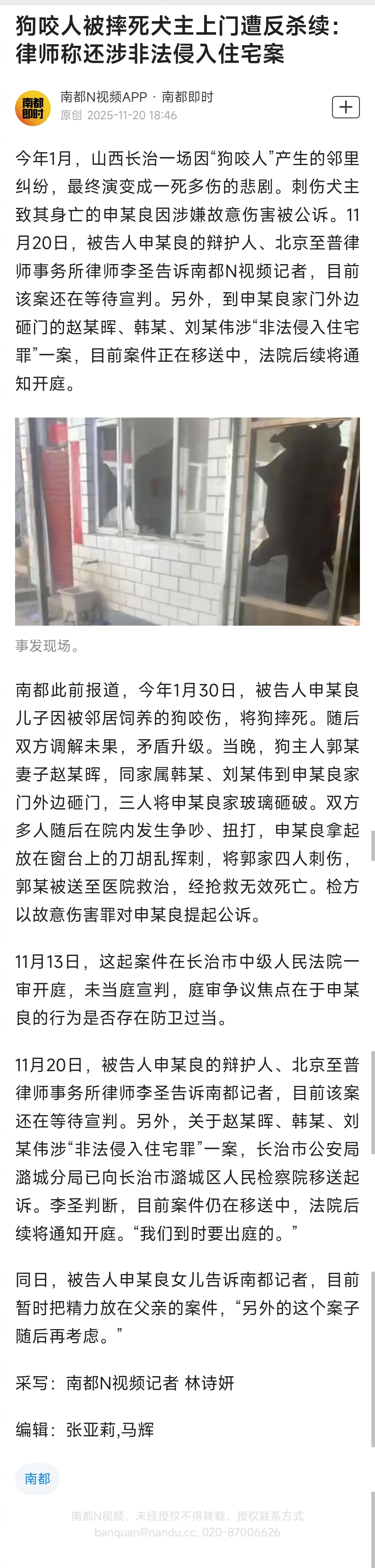 【狗咬人被摔犬主遭反杀续:砸门者涉非法侵入住宅一案移送检方】今年1月,山西长治一场因“狗咬人”产生的邻里纠纷,最终演变成一死多伤的悲剧。刺伤犬主致其身亡的申某良因涉嫌故意伤害被公诉。11月20日,被告人申某良的辩护人、北京至普律师事务所律师李圣告诉南都N视频记者,目前该案还在等待宣判。另外,到申某良家门外边砸门的赵某晖、韩某、刘某伟涉“非法侵入住宅罪”一案,目前案件正在移送中,法院后续将通知开庭。11月20日,被告人申某良的辩护人、北京至普律师事务所律师李圣告诉南都记者,目前该案还在等待宣判。另外,关于赵某晖、韩某、刘某伟涉“非法侵入住宅罪”一案,长治市公安局潞城分局已向长治市潞城区人民检察院移送起诉。李圣判断,目前案件仍在移送中,法院后续将通知开庭。“我们到时要出庭的。”同日,被告人申某良女儿告诉南都记者,目前暂时把精力放在父亲的案件,“另外的这个案子随后再考虑。”
