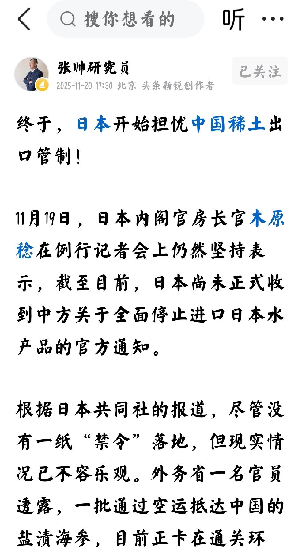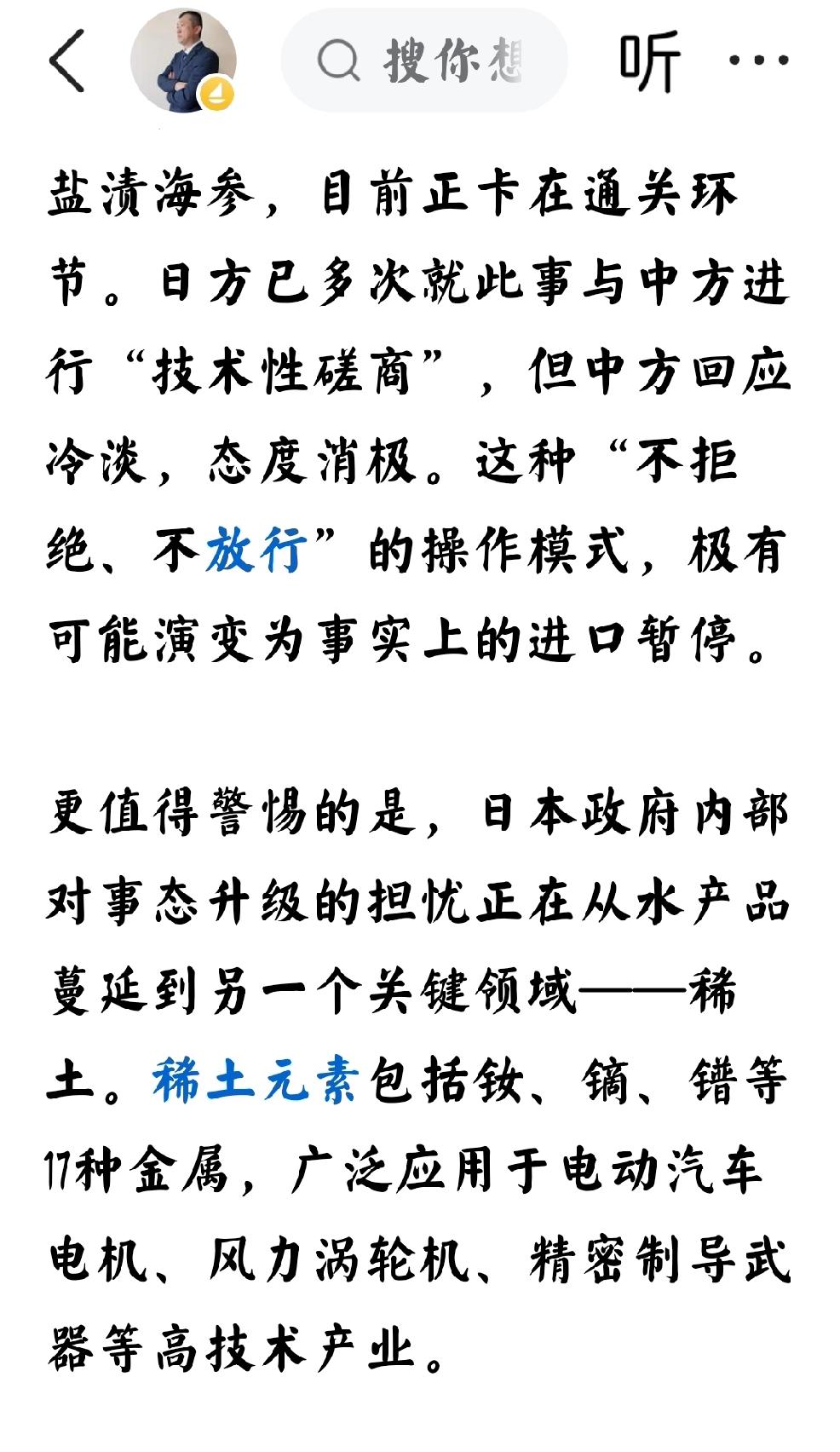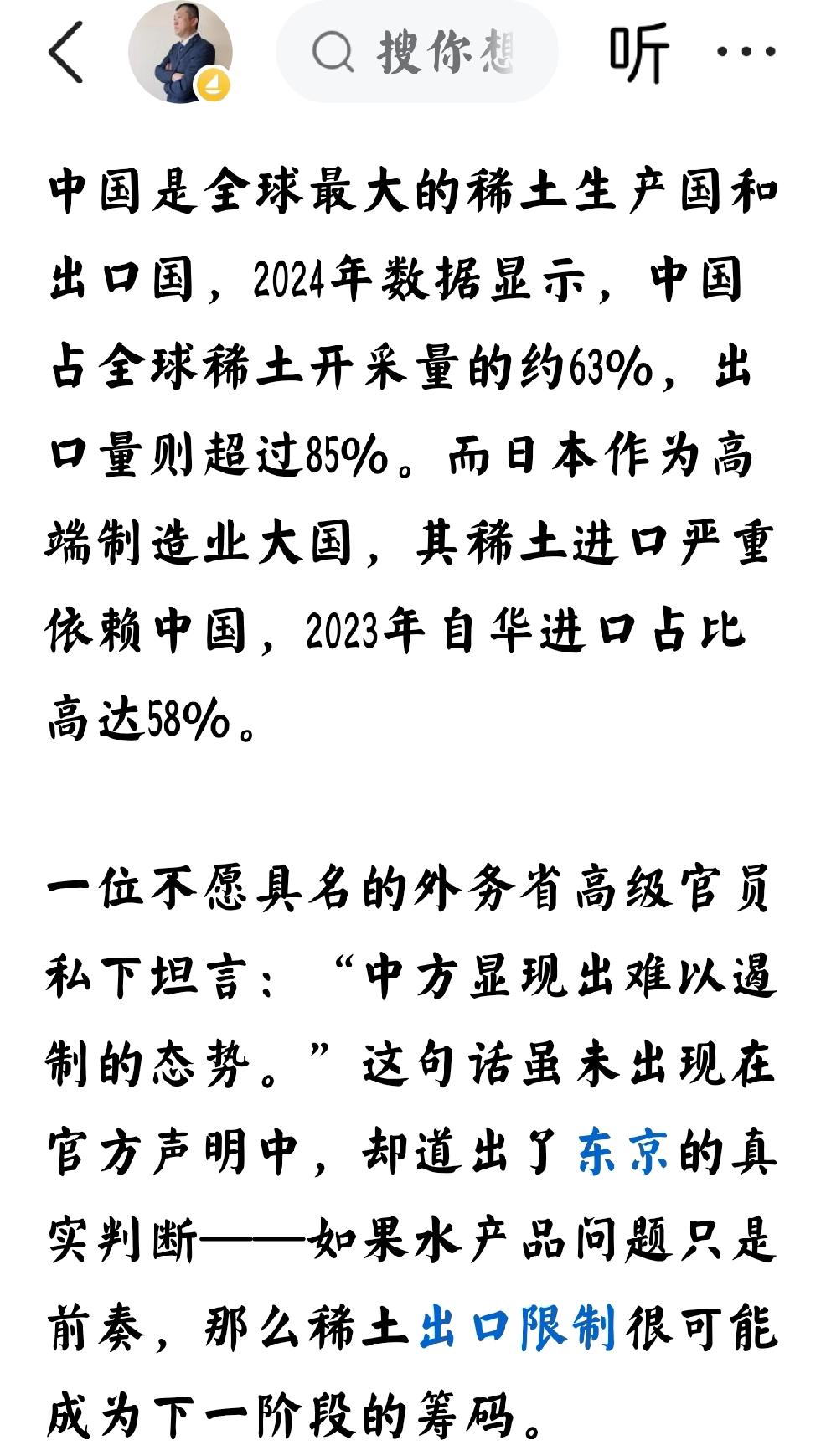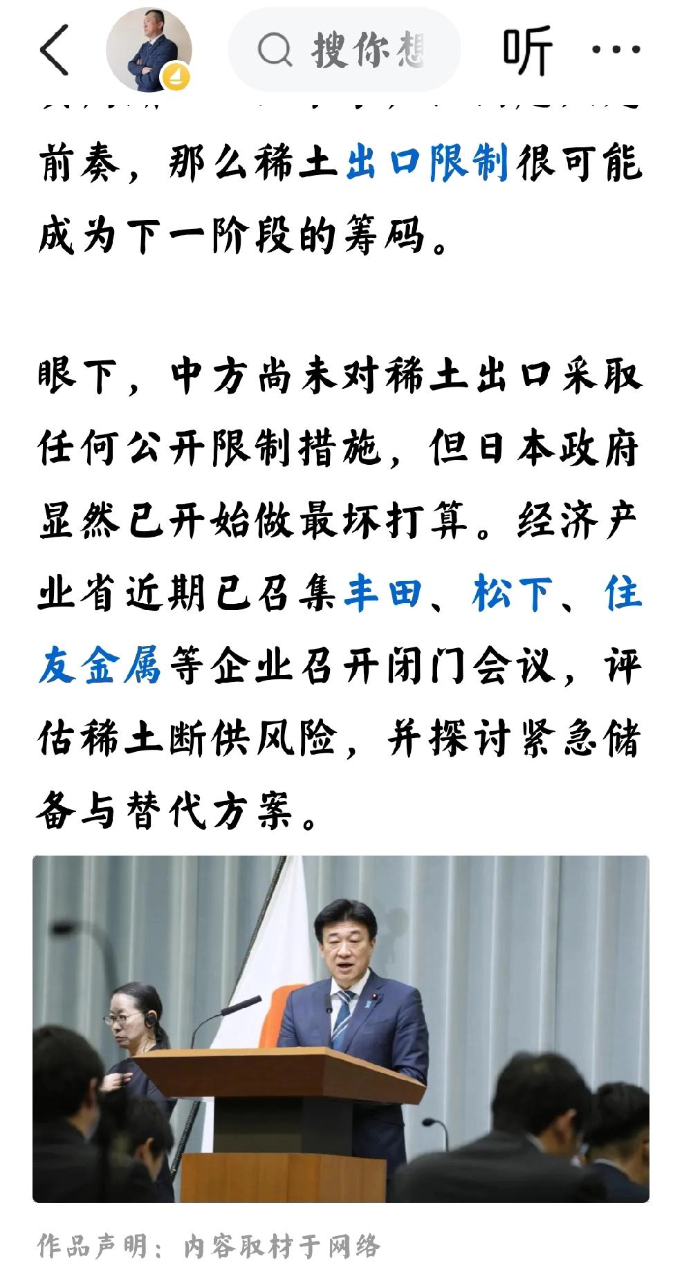 支持国家采取对日稀土出口限制 个人观点•大概率预判:个人认为,下一步将对日本采取稀土出口限制。 我们把稀土出口给日本,日本制造武器,侵略中国。 日本人吃着中国大米,中国农产品,养精蓄锐,侵略中国。 对日本采取稀土出口管制以及对日本采取农产品出口管制。