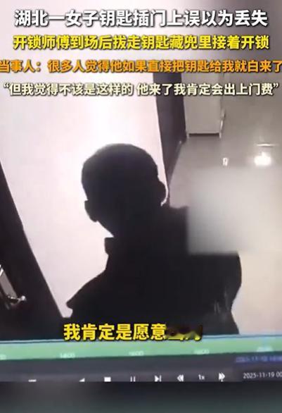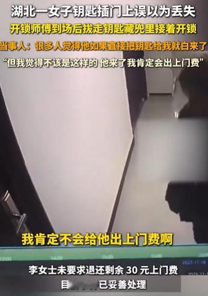 湖北一女子回家找不到钥匙,叫了开锁师傅,不料,师傅到场后,竟然偷偷拔走钥匙藏兜里,然后接着开锁,最后收了女子80块钱,原来,女子钥匙插门上,误以为丢失!进屋后还是找不到钥匙,就查看监控,结果才发现了真相! 李女士称,当时发现兜里没钥匙,她马上回到车里找,座垫缝、脚垫底下、扶手箱翻了个底朝天,连钥匙的影都没见着。她急得直跺脚,赶紧在手机平台下了开锁单,刚到门口,开锁师傅已经扛着工具箱等在那儿了。 师傅手脚倒麻利,掏出工具捣鼓几分钟就把锁开了。李女士冲进屋,衣柜、抽屉、玄关柜又翻了遍,钥匙还是没踪影。 她越想越不对劲:出门前明明记得带了,家里就这点地方,咋会凭空消失?干脆调了门口监控——这一看,火气直冲天灵盖! 监控里清清楚楚:钥匙就插在门锁上没拔,师傅到了之后,先左右扫了圈没人,飞快把钥匙拔下来揣进裤兜,接着跟没事人似的蹲下来开锁。那串钥匙上还串着车钥匙,全被他顺走了! 李女士立马打师傅电话,把监控截图发过去,直截了当说:“80块开锁费退我50,钥匙赶紧送回来。”师傅估计也慌了,喊了个跑腿把钥匙送过来,转了50块退款。 李女士也没揪着不放,把剩下30块留给他:“你跑这一趟不容易,上门费该给。” 女子吐槽:评论区有很多他同行,他们反而觉得这个行为很对,就是觉得,这个钱如果他要是给我钥匙了,我肯定不会给他出上门费! 我肯定是愿意出的,不然我最后也不可能退他30块钱。 这师傅的心思,大概率是三种心理:一是觉得“白跑一趟不划算”,跑了十几二十分钟,不说破就能赚80块,说破了顶多拿点上门费; 二是侥幸心理,觉得顾客急着进门,不会调监控查;方便以后干点什么。 三是可能听同行说过这种“套路”,觉得“大家都这么干,不算啥”。 可他忘了,做生意最忌“耍小聪明”——街坊常说“君子爱财,取之有道”,他这是把“道”丢了。 从法律上讲,师傅这种行为算“欺诈”——故意隐瞒钥匙存在的事实,骗取开锁费,李女士要是较真报警,他不光要退全款,还可能被平台处罚。 退一步说,师傅要是实诚点说“你钥匙插门上了,我帮你拔了”,李女士大概率给50块上门费还得说声谢谢,既赚了钱又落了好,何必耍套路把名声搞臭?这就是“聪明反被聪明误”。 开锁这行吃的是“信任饭”,顾客把家门钥匙的事交出去,信的是师傅的人品。反观襄阳这师傅,利用顾客的着急耍套路,看似赚了眼前的小钱,实则砸了自己的饭碗。 你们对此事怎么看?