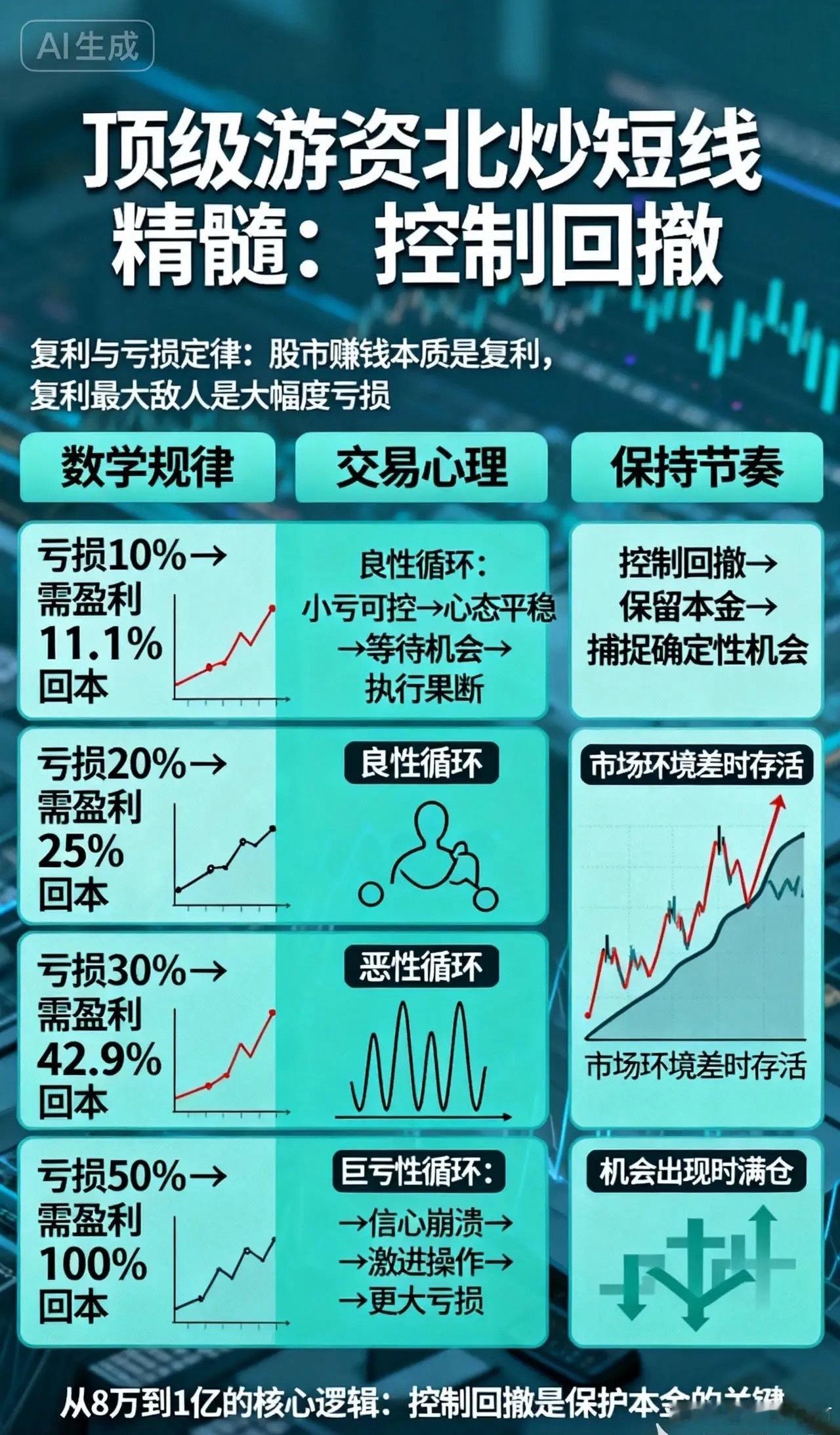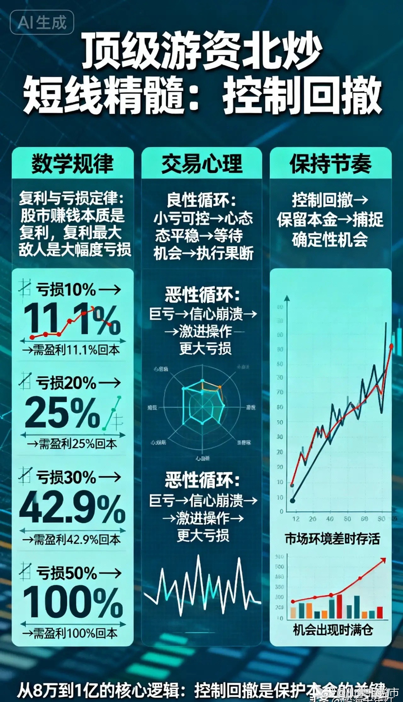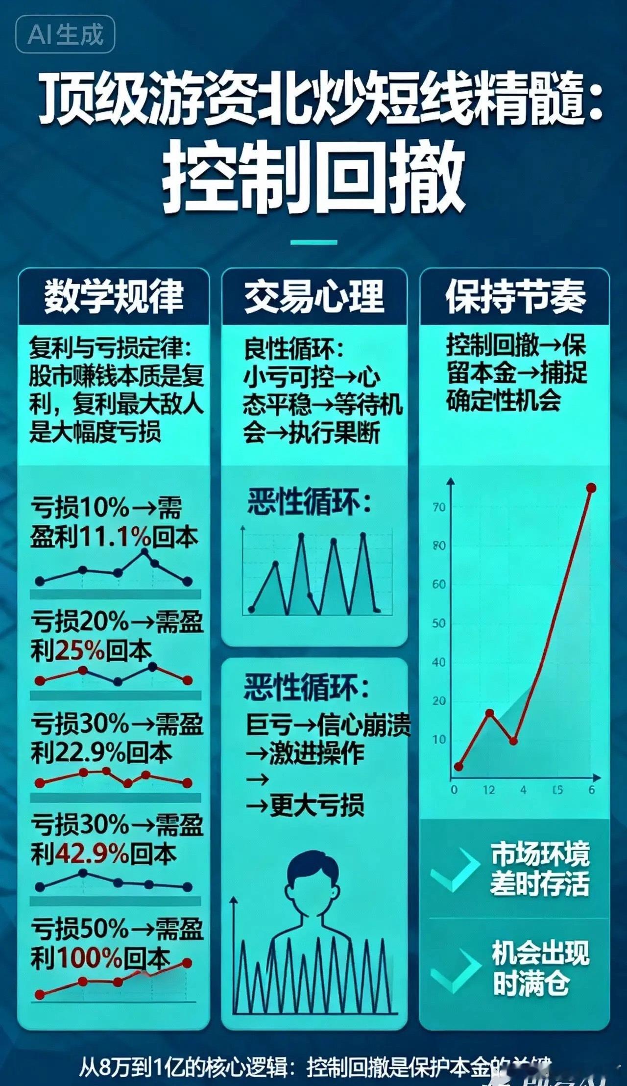 控制好回撤会越做越顺,从8万到1亿,顶级游资北炒短线精髓:控制回撤。为什么“控制回撤”如此重要?这背后的核心是 “数学规律” 和 “交易心理” 的双重作用。第一,数学上的复利与亏损定律才是核心逻辑。股市赚钱的本质是复利。而复利最大的敌人就是大幅度的亏损。这里有一个残酷的数学事实:回撤幅度越大,恢复净值所需的涨幅就越高。亏损10%,需要盈利 11.1% 才能回本。亏损20%,需要盈利 25% 才能回本。亏损30%,需要盈利 42.9% 才能回本。亏损50%,需要盈利 100%(翻倍)才能回本!解读起来就是:如果你不慎亏损了50%,你需要赚一个100%才能回到起点。这不仅需要时间,更需要极强的运气和能力,难度呈指数级上升。而如果你能将每次的亏损都控制在很小的范围内(比如5%-8%),那么你只需要一个不大的盈利(5.3%-8.7%)就能创新高,这要容易得多。“控制回撤”就是保护你的本金,让你始终处于一个“容易恢复并创新高”的数学游戏中。保护本金永远是第一位的。而控制回撤是保护本金的重要手段。第二,交易心理的良性循环。大亏的恶性循环是,一次巨亏会严重打击信心,导致后续操作变形。比如,为了快速回本而进行更激进、更不理性的操作,结果可能导致更大的亏损。心态一旦崩溃,就容易陷入“追涨杀跌”的陷阱。小亏的良性循环是,当你习惯了严格止损,每次亏损都在可控范围内,你的心态会非常平稳。你知道这只是一次正常的“交易成本”,不会伤筋动骨。这种平稳的心态让你能够冷静地等待下一个符合你模式的机会,并果断执行。“做顺”的感觉,本质上就是心态顺、节奏顺。心态稳定,接受能力强,才能保持足够定力和正常发挥能力。第三,保持交易节奏和战斗力。控制回撤意味着你在市场环境不好、自己状态不佳时,能够有效地“活下去”。这让你保留了大部分本金和实力,当市场出现确定性高的机会时,你还有充足的“弹药”去捕捉它。如果总是在大亏后被动等待回本,就会错过无数真正的机会。控制回撤才能稳定脚步,在系统机会内开仓,踩准市场交易节奏。控制回撤是通过遵守数学规律来保护本金,通过维护交易心态来保证执行力,最终实现资产的平稳复利增长,从而感觉“越做越顺”。