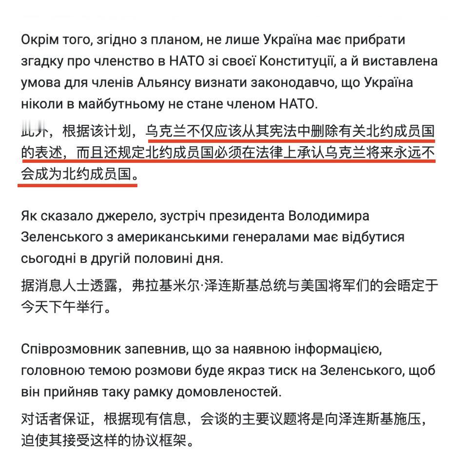 乌克兰收到美国敦促其投降的“和平计划”。根据乌克兰RBC-Ukraine的说法,该文件由美国跟俄罗斯共同制定,对战争罪行实行大赦,让俄罗斯重返全球经济。而乌克兰不仅要从宪法中删除有关北约成员国的表述,还规定北约必须在法律上规定乌克兰永远不会成为北约成员国,也不允许在乌克兰境内部署外国维和部队。 RBC-Ukraine透露,文件还规定乌克兰必须把整个顿巴斯东部地区(包括目前由基辅控制的土地)移交给俄罗斯。除此以外,乌克兰还必须放弃武装部队的一半兵力,以及更多其他条件。 RBC-Ukraine网站在文章里说:“据称,该文件包含28项条款,实际上是要求乌克兰投降。” 你看,泽连斯基果然拿到了不断要求的“安全保障”条款——对战争罪行实行大赦!当然,他还必须像少女一样的表现出矜持,不能一口答应,但芳心已经飞到伦敦或纽约了。战争结束后,他可以坐在珠宝店的一个角落,一边品尝上好的罗曼尼康帝,一边陷入沉思,挥毫写下一本回忆录,书名可以是《乌克兰永不投降》。如果好莱坞盯上他,他还可以重操旧业,以从演员总统到真总统再回到演员总统的独特经历载入史册,而群众演员都是真实的战士,这在世界影坛上同样独一无二。他甚至可以跟比莎士比亚齐名,都是悲剧作者,并且都很有钱。