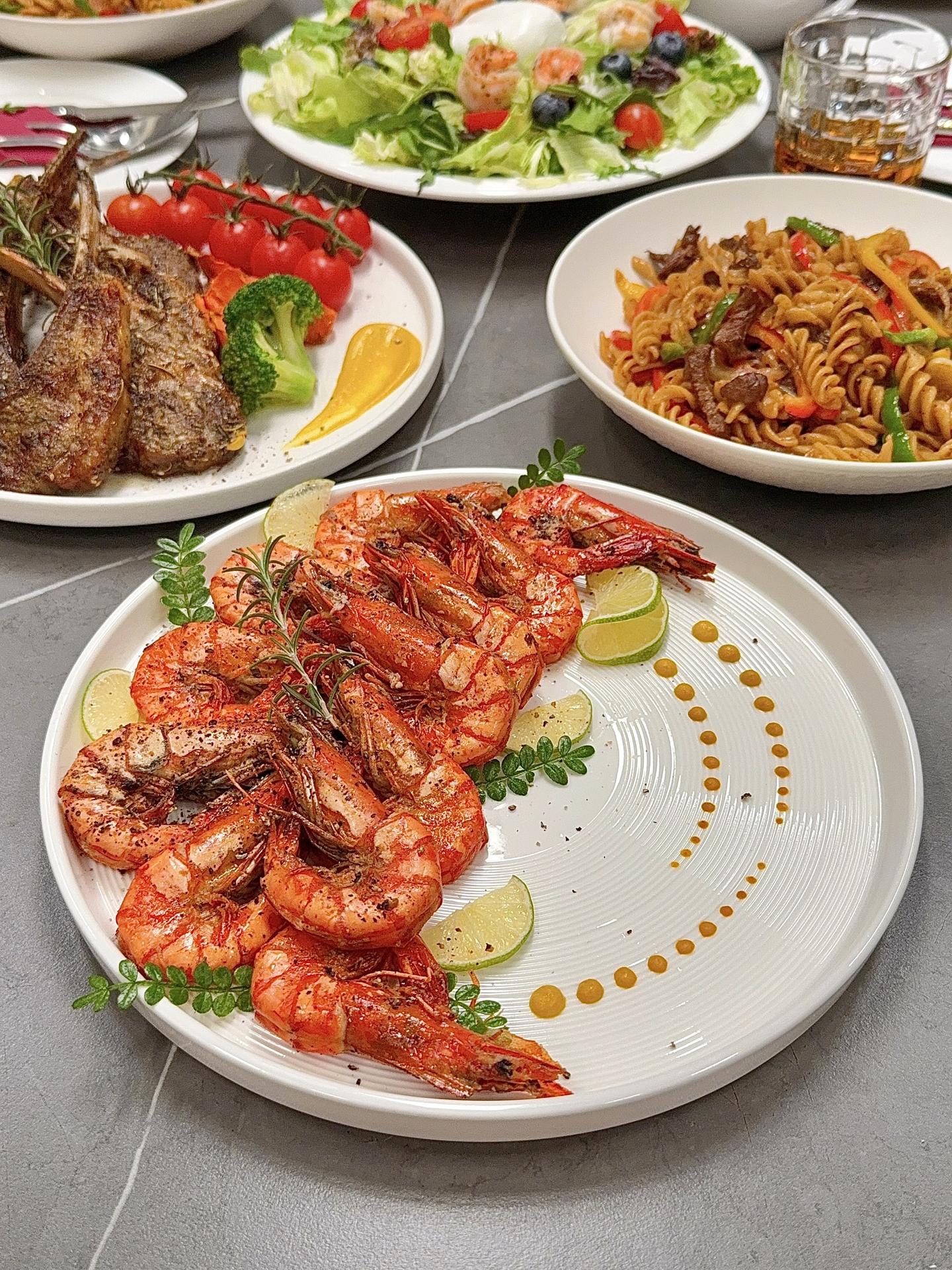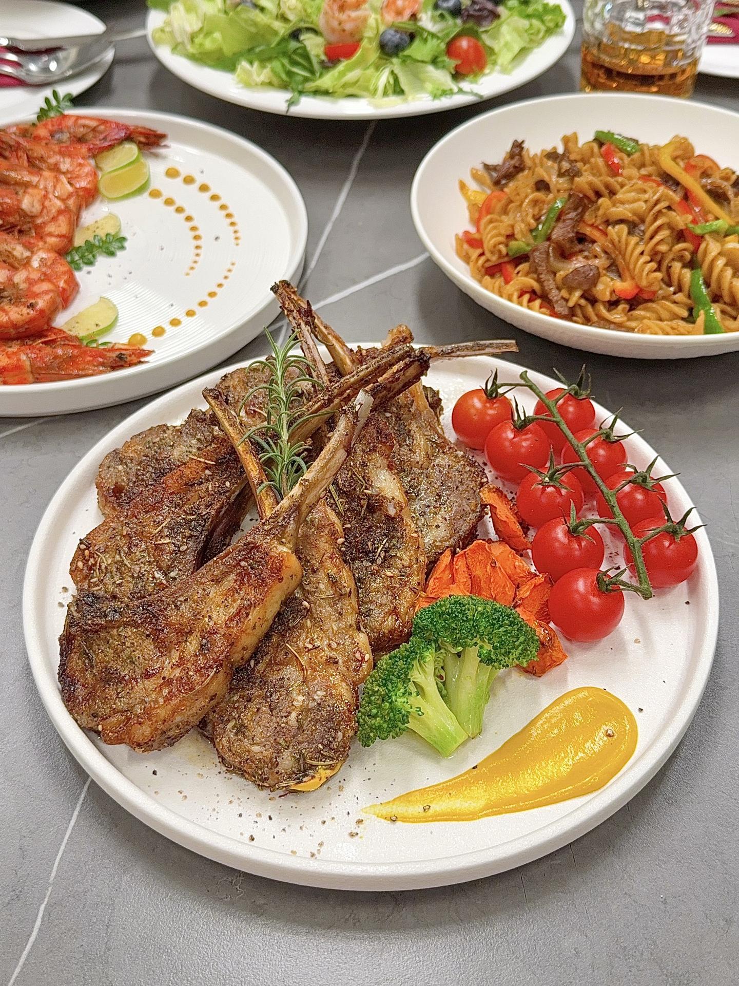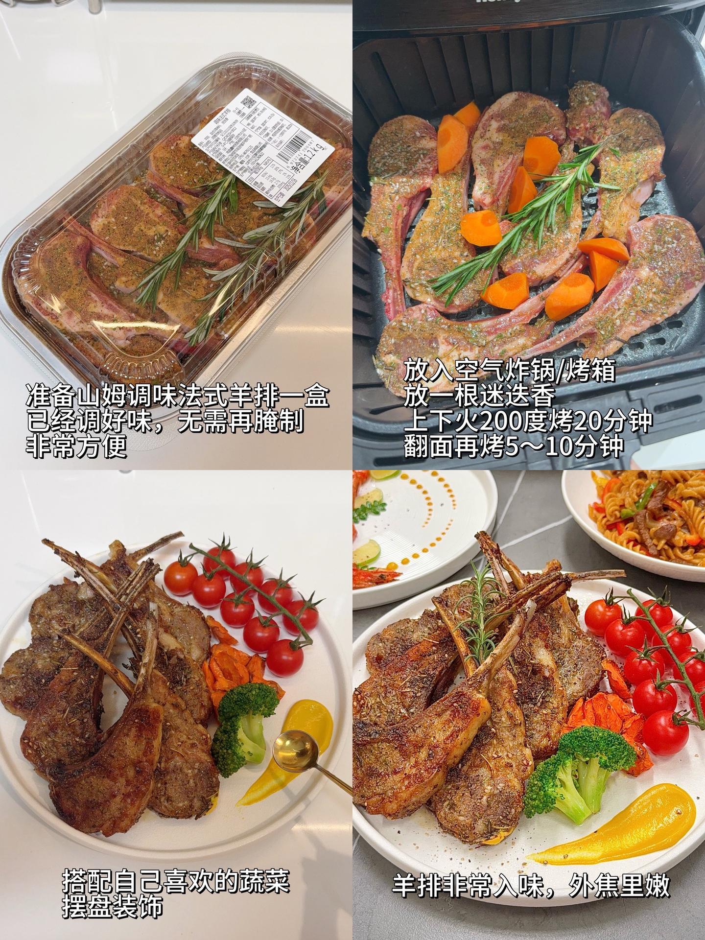 只需一小时就能轻松搞定餐桌仪式感。🌈今日家宴菜单分享: ❶【嫩烤法式羊排】 ❷【黄油煎黑虎虾】 ❸【咖喱汤锅】 ❹【黑椒牛柳意面】 ❺【马斯卡彭奶酪沙拉】 ❻【奶油南瓜羹】 🥝水果:蓝莓&串番茄&奇异果
