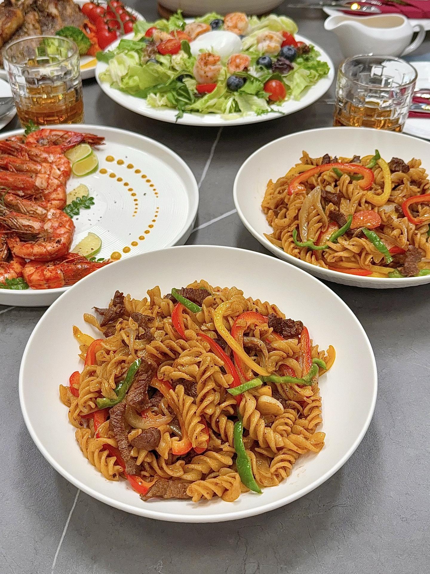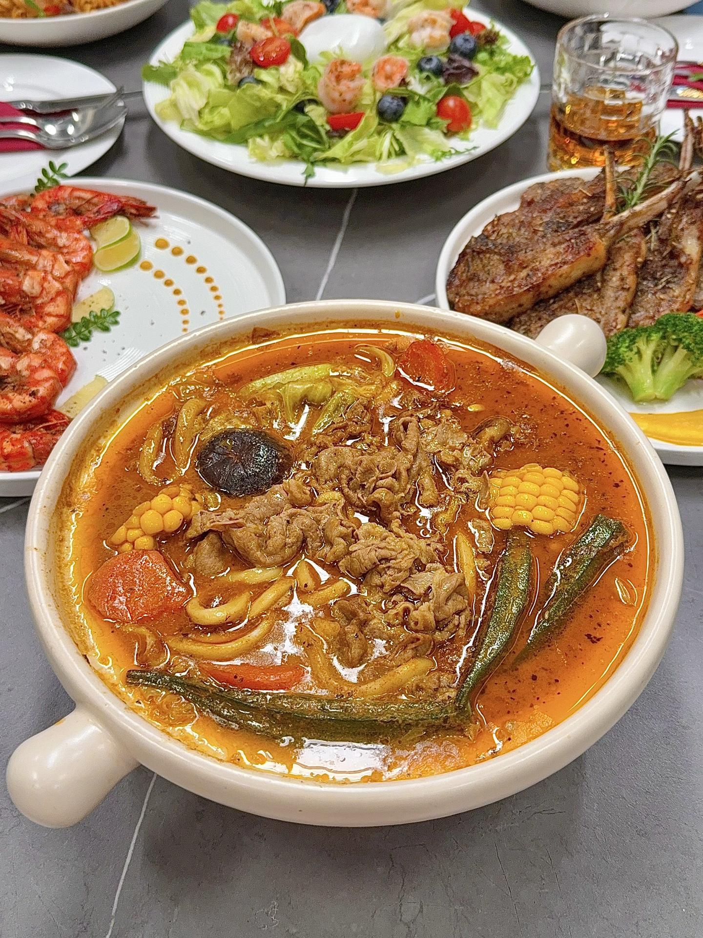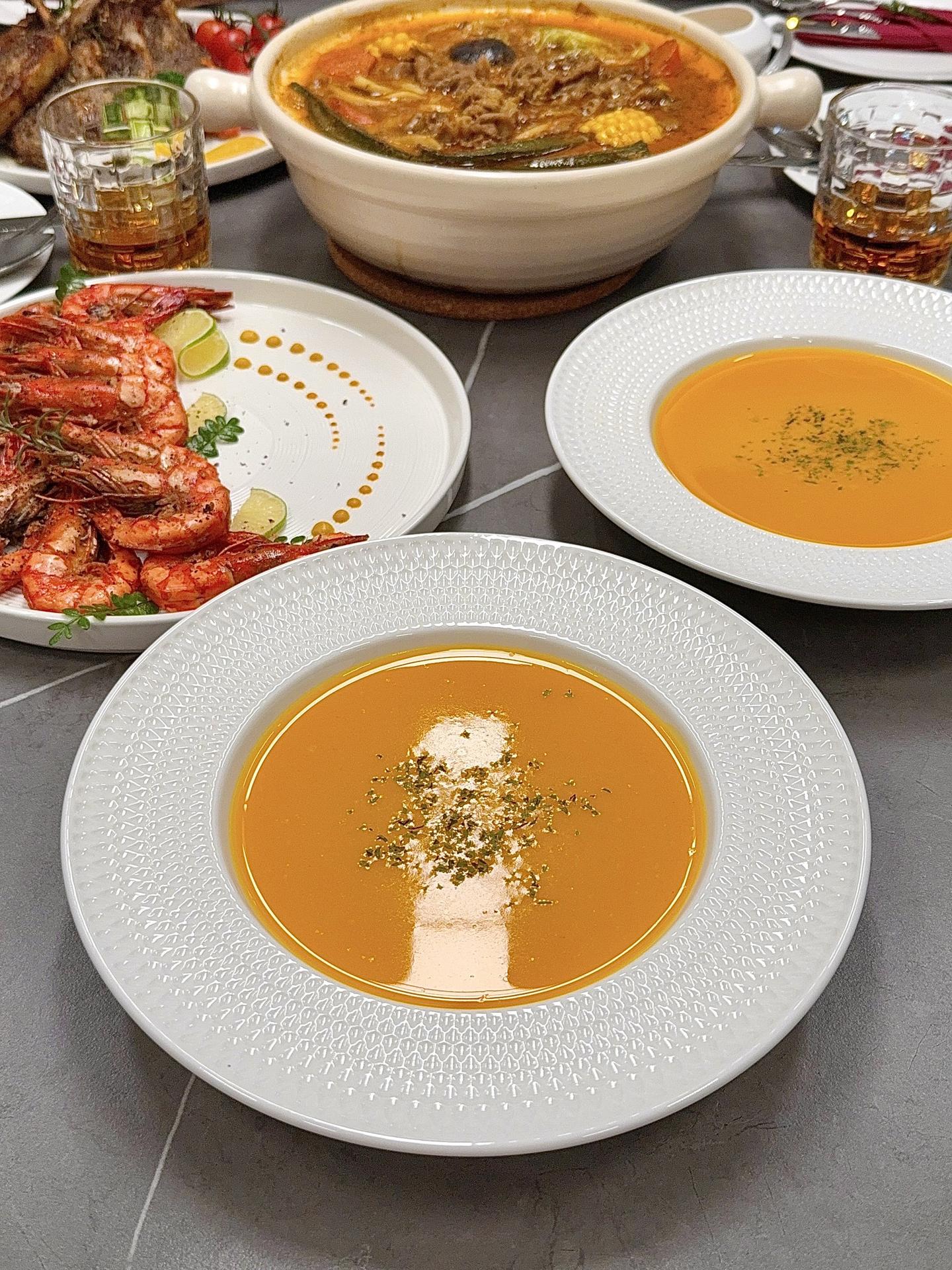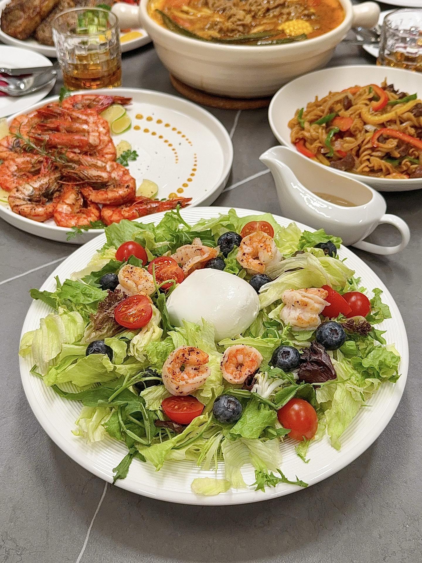 只需一小时就能轻松搞定餐桌仪式感。🌈今日家宴菜单分享: ❶【嫩烤法式羊排】 ❷【黄油煎黑虎虾】 ❸【咖喱汤锅】 ❹【黑椒牛柳意面】 ❺【马斯卡彭奶酪沙拉】 ❻【奶油南瓜羹】 🥝水果:蓝莓&串番茄&奇异果