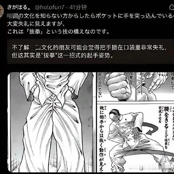 插兜照火了以后有外国网友都神经错乱了?直接牵扯出来了武侠世界!今天无意间发现一张外网截图,大概是一外国网友对插兜照的全新恶搞理解,他认为这是传说中“拔拳”的起手式,本以为这只是在恶搞。但我去查了一下资料,原来还真有“拔拳”这一说,只不过是虚构的拳术而已,常见于《勿牙》《打穿综漫从龙书文开始》等作品中。所以这张截图上信息的作者要么神经错乱、要么是在恶搞。[捂脸]