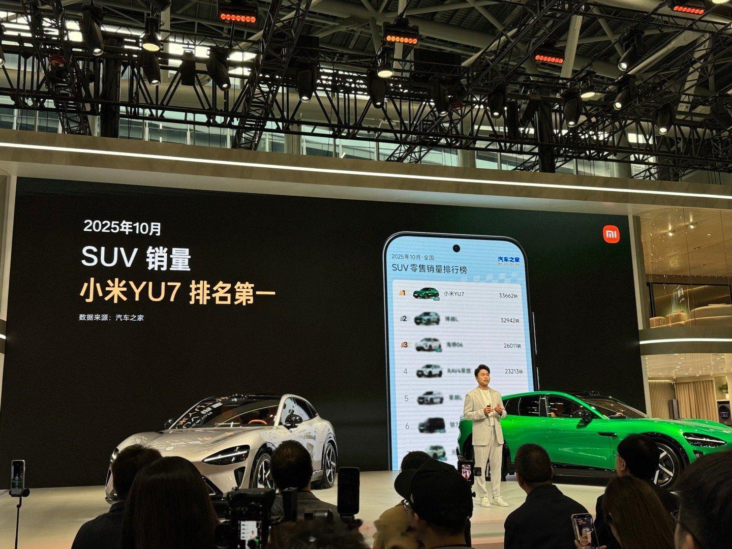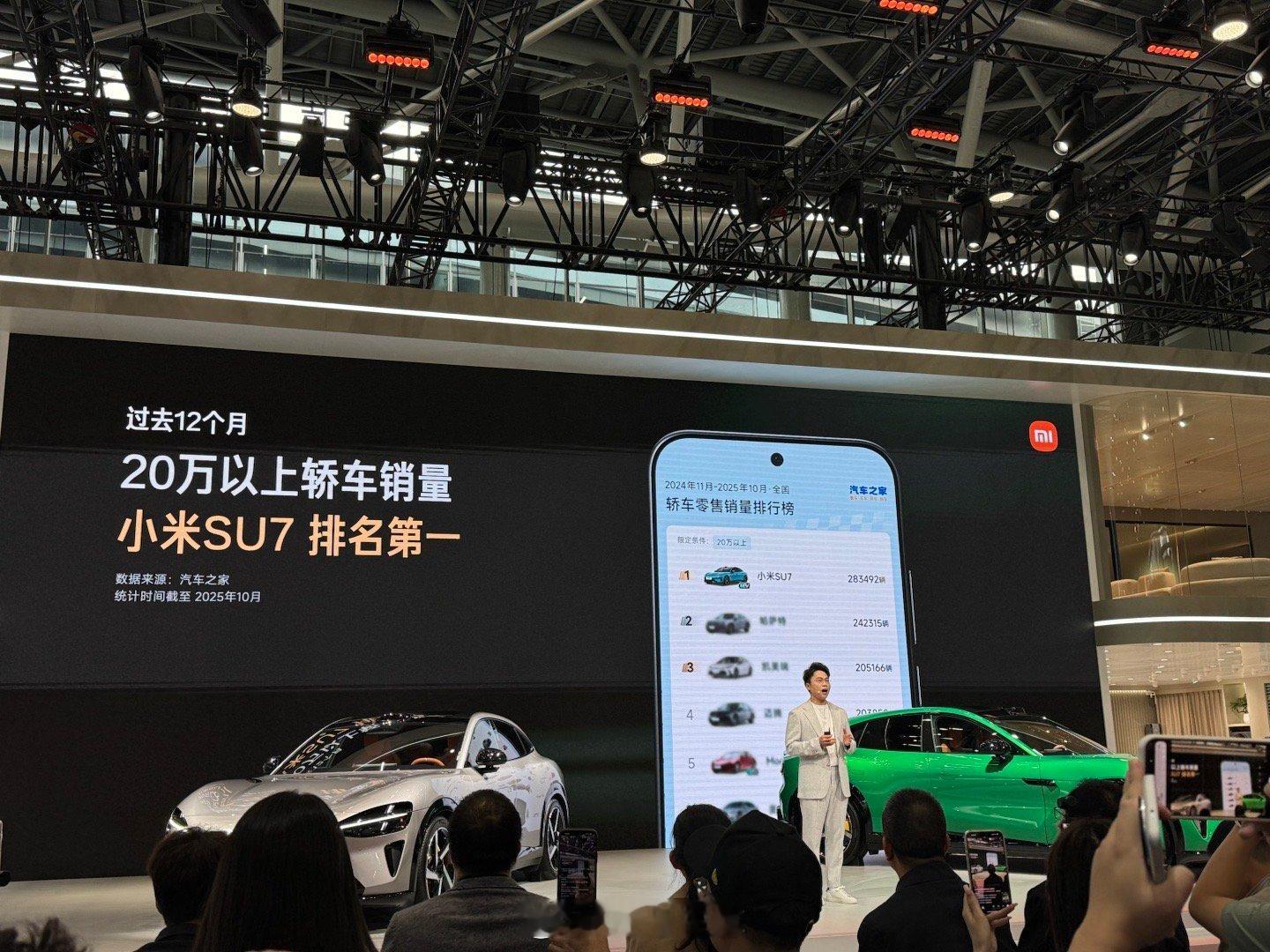 小米汽车副总裁李肖爽首度亮相小米发布会,先谈销量:过去一年 20 万以上轿车销量 SU7 第一,10 月 SUV 销量 YU7 第一,昨天刚刚下线 50 万台。
