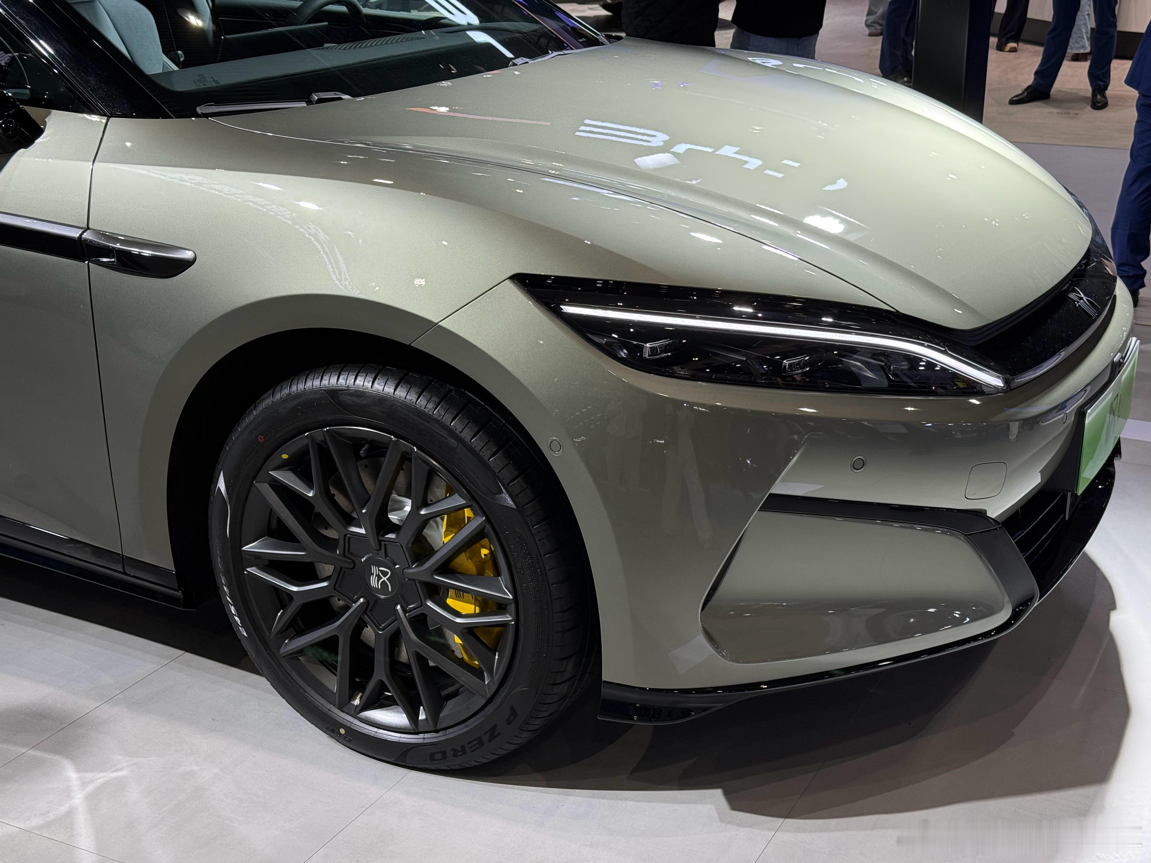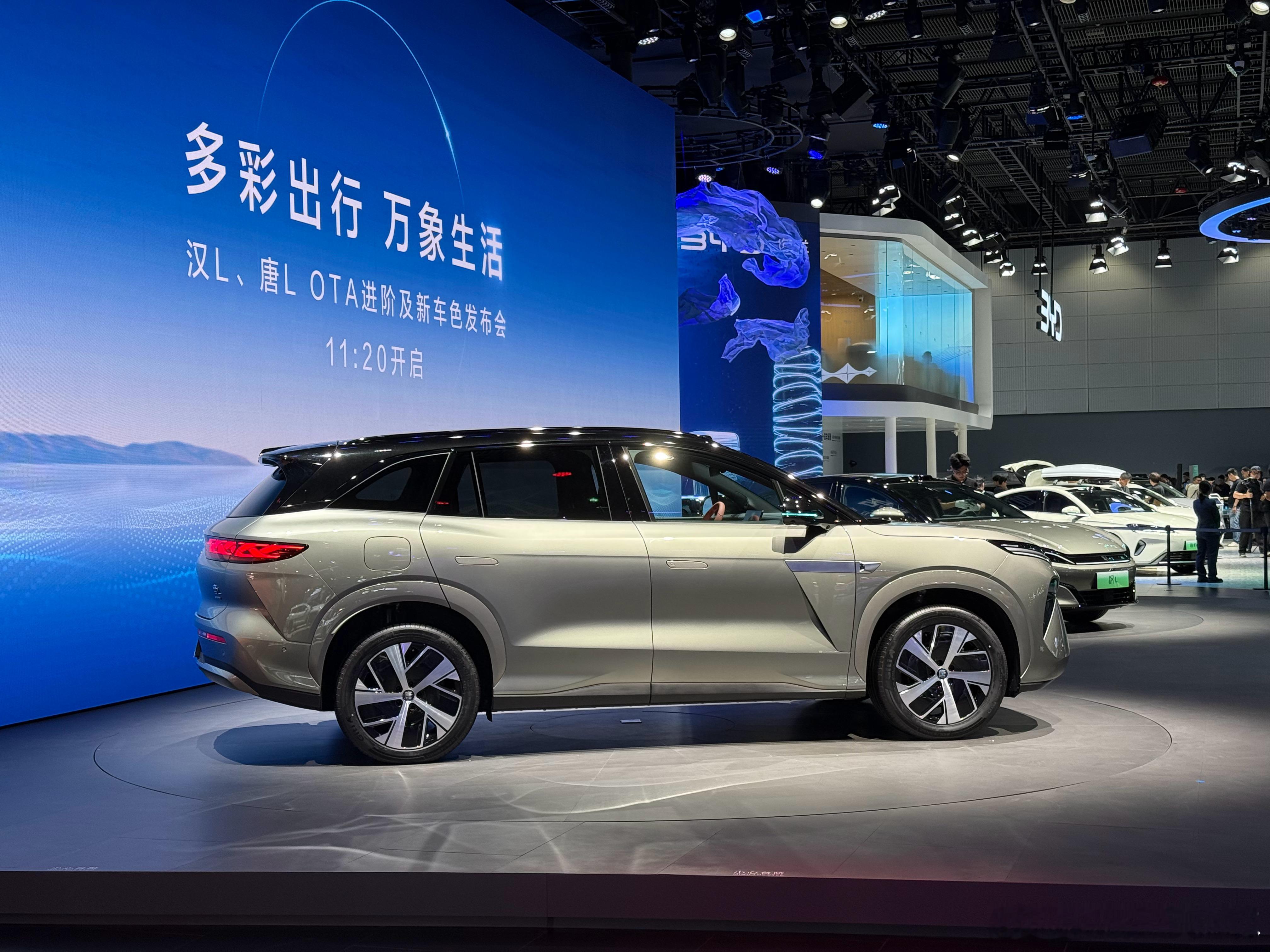 汉L和唐L新增的橄榄绿车漆,还是黑+绿的双拼设计,这个颜色在市面上很少见,比较有个性,另外汉L也上了全新造型的轮毂,力量感更足