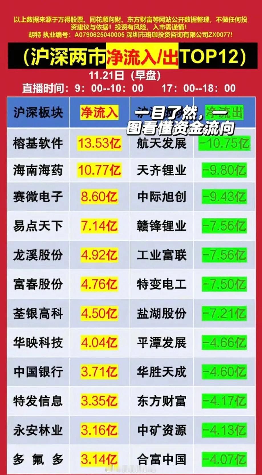 11月21日沪深两市早盘资金净流入/出TOP12榜单梳理分析!其中净流入端以榕基软件(13.53亿)为首,覆盖软件、医药等多板块;净流出端由航天发展(-10.75亿)领跑,集中在锂电、科技等前期热门赛道,体现早盘资金在板块间的分化流向。净流入个股分析1. 榕基软件:早盘获13.53亿净流入居首,属软件板块。资金涌入或源于其政务、企业信息化业务的短期热度,不过这类情绪驱动标的,后续波动风险需留意。2. 海南海药:净流入10.77亿,隶属医药板块。资金流入或关联医药政策、公司业务进展,短期关注度高,但需结合基本面验证热度持续性。3. 赛微电子:获8.60亿净流入,聚焦微电子领域。资金青睐或关联半导体产业链景气预期,不过板块波动大,需关注行业周期与产能进展。4. 易点天下:净流入7.14亿,主打互联网营销。资金流入或因数字营销业务短期偏好,但题材股资金进出快,后续回调风险需警惕。5. 龙溪股份:获4.92亿净流入,主营机械轴承。资金涌入贴合高端制造热度,不过业务较细分,需关注行业需求端变化。6. 富春股份:净流入4.76亿,覆盖通信、游戏。资金流入或源于题材炒作,跨界业务个股波动大,需结合业务进展判断走向。7. 荃银高科:获4.50亿净流入,属农业种业。资金青睐或关联农业政策、种业周期,不过板块受周期影响大,短期热度难长期延续。8. 华映科技:净流入4.04亿,聚焦显示面板。资金流入或与面板复苏预期有关,不过行业竞争激烈,需关注供需格局变化。9. 中国银行:获3.71亿净流入,属低估值蓝筹。资金流入是避险情绪下的配置选择,银行股波动平缓,适合稳健型短期布局。10. 特发信息:净流入3.35亿,涉及通信设备。资金流入关联通信题材热度,不过行业受技术、订单影响大,需跟踪业务落地。11. 永安林业:获3.16亿净流入,属林业板块。资金涌入或关联生态政策,不过业务周期长,短期热度具阶段性。12. 多氟多:净流入3.14亿,主营氟化工、锂电材料。资金流入或源于锂电材料修复预期,不过行业竞争烈,需关注产品价需变化。净流出个股分析1. 航天发展:净流出10.75亿居首,属军工板块。资金流出是前期涨幅后的获利了结,军工受事件驱动影响大,短期情绪降温。2. 天齐锂业:净流出9.80亿,锂电龙头。资金流出贴合板块短期调整,虽锂资源充足,但行业供需变化下资金暂时避险。3. 中际旭创:净流出9.43亿,光通信标的。资金流出是光模块板块回调,虽行业景气高,但短期资金获利了结意愿强。4. 赣锋锂业:净流出7.56亿,锂电材料龙头。资金流出随板块调整,业务布局广,但短期赛道偏好下降。5. 工业富联:净流出7.56亿,科技制造龙头。资金流出是前期资金兑现需求,涉及AI硬件但市场情绪波动触发撤离。6. 特变电工:净流出7.50亿,覆盖输变电、新能源。资金流出随新能源板块调整,业务多元但短期资金偏好切换。7. 盐湖股份:净流出7.21亿,盐湖提锂龙头。资金流出随锂电降温,资源优势明显但短期获利了结意愿强。8. 平潭发展:净流出4.66亿,涉林业、基建。资金流出是题材炒作后热度退散,多元业务个股资金进出节奏快。9. 华胜天成:净流出4.60亿,聚焦IT服务。资金流出因科技板块分化,业务受竞争、订单影响,体现情绪波动。10. 东方财富:净流出4.17亿,证券龙头。资金流出随证券板块调整,虽为互联网券商龙头,但交投情绪波动下资金暂时撤离。11. 中矿资源:净流出4.13亿,涉锂电资源。资金流出随板块调整,资源布局广但短期赛道偏好下降。12. 合富中国:净流出4.07亿,属医疗服务。资金流出是前期热度后回调,个股受政策、业绩影响,短期情绪降温。总结今日早盘沪深两市资金流向分化显著:净流入端是软件、医药等细分板块的短期情绪驱动;净流出端是锂电、科技等热门赛道的获利了结或偏好切换。整体资金在板块间腾挪特征明显,短期波动较大,需结合板块景气度与个股基本面理性评估。本文涉及资讯、数据等内容来自网络公共信息,仅供参考,不构成投资建议!