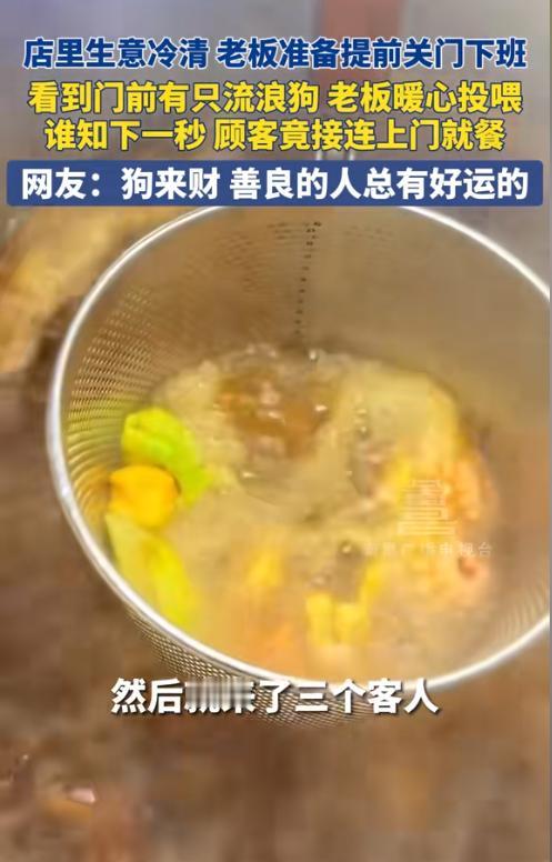 科学也解释不清了!近日陕西西安,一老板看没有生意,就打算提前关门,关门时发现门口有一只一瘸一拐的流浪狗,老板就拿出些食物投喂它,没想到就在投喂的过程中,发现了件意想不到的事情。 那天老板收拾好后厨,正准备拉下卷帘门,脚边忽然传来微弱的动静。低头一看,是一只黄白色的流浪狗,右后腿明显受伤,走路一颠一颠,浑身毛发乱糟糟的,正怯生生地望着他。 目睹那流浪狗瑟缩之态,老板未作思忖,旋即折返厨房,寻出一块鸡胸肉,热好一小碗白米饭,而后轻柔地置于门口的地面之上。 从这天起,老板养成了固定的习惯,每天都会用干净的饭盒装好食物,放在门口铺好的旧棉垫上。 这只流浪狗也像有了默契,总会在同一时间出现,吃完东西就趴在棉垫上休息,不吵不闹,偶尔抬眼看看来往的路人,成了店门口一道安静的风景。 老板还特意带它去宠物医院检查治疗腿伤,经过一段时间的照料,狗狗的伤势慢慢好转,性格也变得越来越温顺。 变化是从一位外卖骑手路过开始的。这位骑手目睹老板投喂流浪狗狗的温馨一幕后,特意停下坐骑,信步踏入店内。随后,他热心地将这家店铺推介到了外卖群组之中。 没过多久,几个年轻人路过时发现了门口的旺财,得知是老板一直在照料,当即进店消费,还拍了视频分享到网上。 这些自发的分享渐渐有了回响,先是附近的居民和上班族慕名而来,接着有短视频博主专程赶来采访,拍下赵先生和旺财的日常画面。 相关视频很快登上了本地热搜,越来越多人知道了这家有温度的面馆,甚至有外地游客特意循着地址找来打卡。 如今的面馆早已不复往日的冷清,每天门口都停满了电动车,客流量比之前翻了几番,客单价也明显提升,营业额从之前一天三四百块涨到了一千多。 客人们进店后,常会先问一句狗狗的近况,有的还会特意带些宠物零食过来。老板也给流浪狗换了更厚实的棉垫,长期购置专用狗粮,把对这只流浪狗的照料融入了日常经营。 随着店铺走红,老板“善待弱小即经营本心”的理念被更多人知晓。越来越多的人走进这家面馆,不仅是为了一碗热面,更是被这份不图回报的善意所吸引。 这只狗狗不再是当初那只受伤的流浪狗,而是成了面馆的特殊成员,见证着这份善意带来的温暖改变。