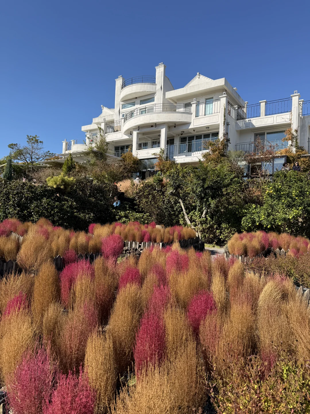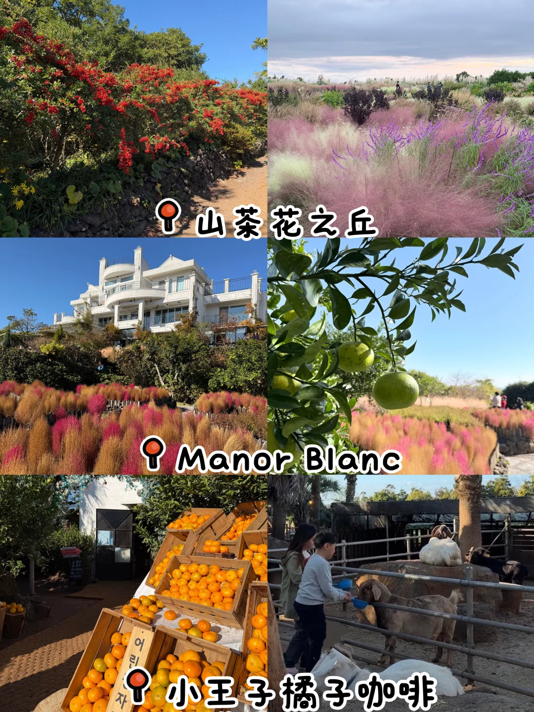 ✨亮点:山茶花之丘的粉黛草造景超超超美,搭配生态池、草坪广场像童话世界一般;Manor Blanc的花园式咖啡馆也超好拍,粉黛+山房山+大海同框,喝着咖啡赏景幸福感爆棚;小王子橘子咖啡藏在橘园里,能喂小羊,解锁绝美济州秋日~
