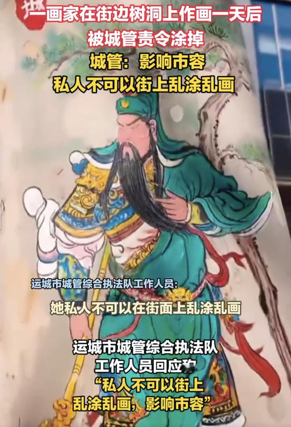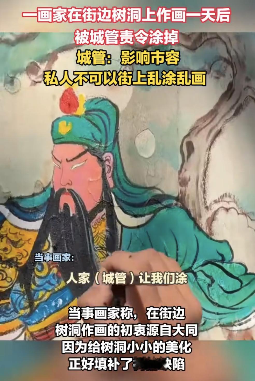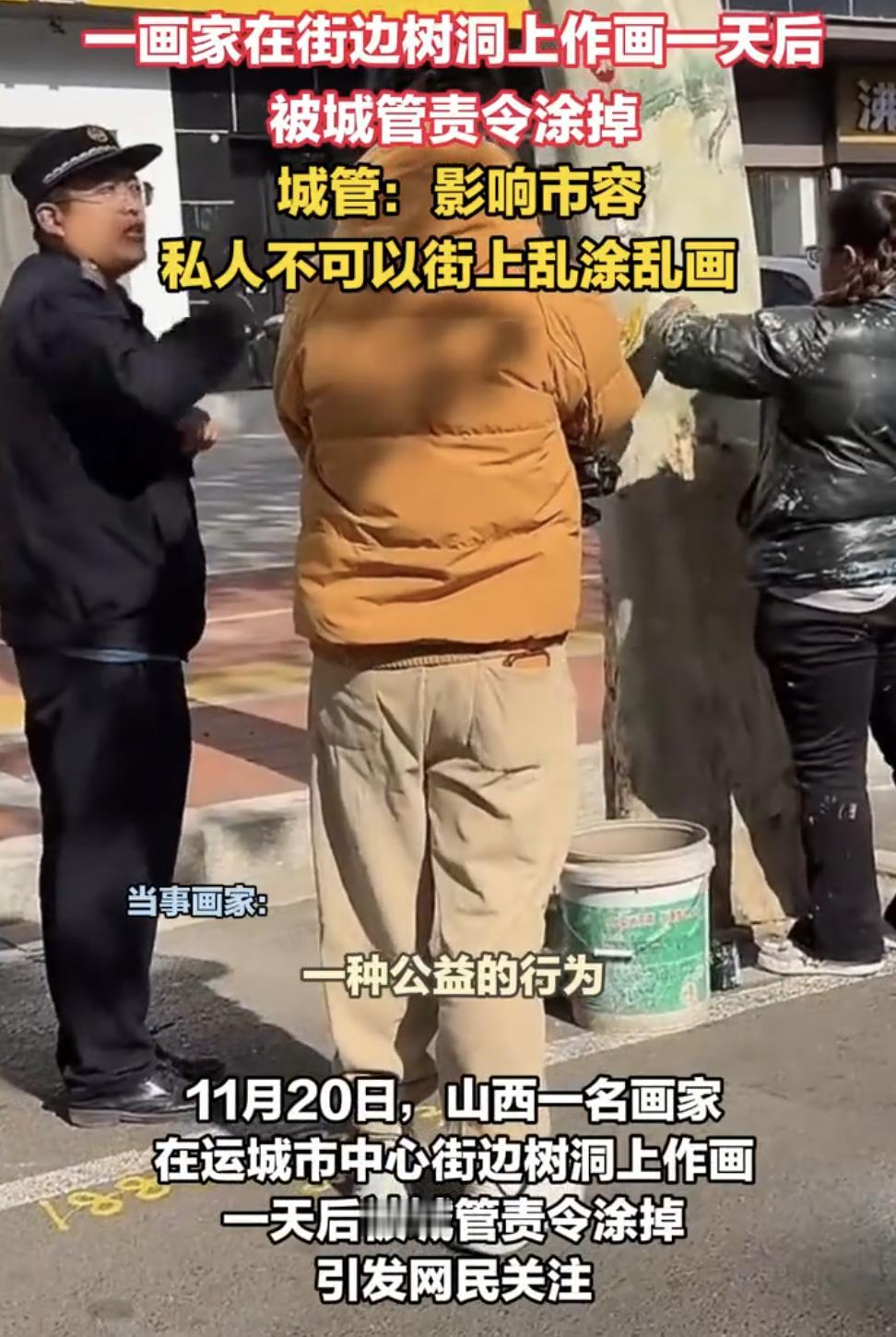 城管做的对吗?山西长治一画家自己出钱树上作画,被责令涂掉! 曝光视频里,这个所谓的画家说这是个人公益行为,完全自己出钱出力。还说城管让她们涂掉他们也很纳闷,不知道什么原因。 感觉听着还挺委屈似的。 可能她本身的出发点是好的,给大街边裸露的树干美化一下,但这是在公共环境,不能说谁想画就画,那不就乱套了吗?城管也说了,这样的行为需要报备。 再者,在大路边的树上,这样的画势必会引起人们的关注,一定程度上就会给行人和车辆造成不安全因素,大家只顾盯着画看忘看路了,可能还会引发交通事故。 这个热点的评论区,大多数网友也是认为这个画家的行为不妥,尽管初心可能是好的,但并不提倡这么做,要是效仿的人多了,这不仅不会美化市容,反而会让市容显得不伦不类。 我们每个人都可以为这个城市做出自己的贡献,但前提上不要影响这个城市的基础秩序,公共空间更是不能任由个人任意利用。 如果山西运城这个画家,能够提前报备一下,相信这次热搜的风评或许是另一个样子。 你这次是站城管还是站画家?评论区,等你的观点!