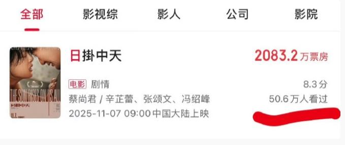 辛芷蕾有可能无缘明年的百花奖了 百花奖是观众投票奖,所以有观影人次要求,入选影片需要满足100万人次观影,但是截止到目前为止,《日掛中天》的观影人次只有50万人,根本达不到参评门槛,所以这个百花影后估计有点悬了。