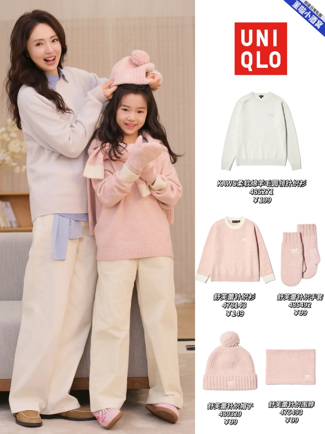 亲子款更是高级感拉满!董璇和小酒窝身着同系列不同色调的优衣库 KAWS 针织,以低调刺绣点缀,不是复制粘贴的同款,而是色彩与风格的默契对话。董璇一身质感羊绒诠释温柔,小酒窝的舒芙蕾绒感针织甜度满分,两种材质一样暖心,母女一起走到哪都是焦点!
