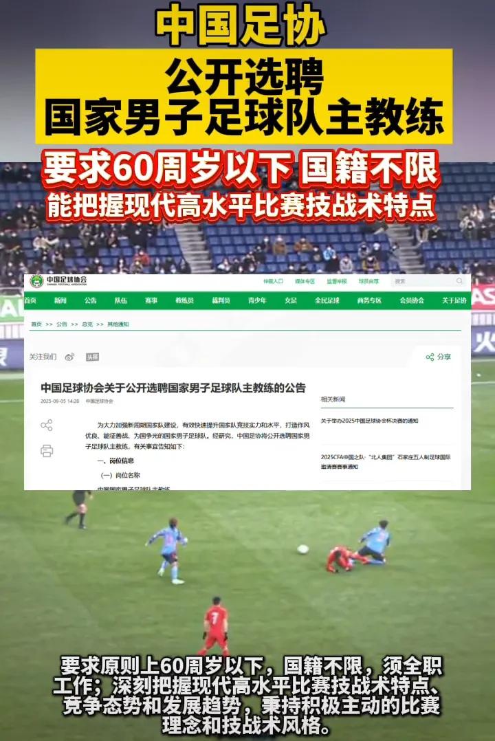中国足协公开选聘国家男子足球队主教练。估计 这个为了缓解国内痛骂的压力而已,走个