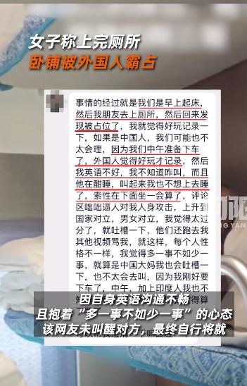 “真窝囊!”女子坐高铁,中间睡醒了去上个厕所,回来的时候发现自己卧铺被一个外国人占了,可女子接下来的行为,却让人看了有点憋屈,网友:对外国人可真包容呢! 据向阳视频10月30日报道,当时女子正在自己的卧铺上一觉沉睡,夜里,她为了去一趟卫生间起身离开,却没料到,就这短短的几分钟时间,她的位置被一个外籍乘客占据了,当她回到自己的铺位前,对方正睡得酣畅如意,仿佛整节车厢都与他无关。 面对这一突如其来的状况,女子也有些懵,因为自己的英语不好,不知道怎么叫,于是权衡再三,她心里那个“多一事不如少一事”的声音占了上风,带着无奈,她转身去了过道将就了一夜。 这段经历被女子拍成视频,原本只想“轻轻一吐槽”,却在社交媒体上点燃了一场热烈的讨论。 有人指责女子对自己的合法权益过于“软弱”,认为占座者应该在第一时间被叫醒;也有人表达了同情,认为她不想引发冲突的心情可以理解。更有不少网友强调,铁路部门在此类情况中完全可以提供帮助,最好的选择是联系列车工作人员。 事件的迅速传播甚至惊动了官方客服。12306及时做出回应,强调这种情况下不必妥协。乘客有权主动寻求列车工作人员甚至乘警的协助。 工作人员的主要职责之一就是维护乘车秩序,确保旅客的合法权益不受侵犯。无论是因为语言障碍,还是身份差异,占座行为都不能被默许,也无需出借自己的舒适与尊严为其买单。 这一回应无疑寄托了普罗大众的共识:权利的底线不该被轻易抹去。而网友讨论的焦点,也逐渐从具体的细节扩展到更深层次的文化现象上。 实际上,这样的冲突在高铁等公共交通中并不鲜见,无论是卧铺车厢、对号座,还是拥挤的自由座车厢,占座行为早非少数。 甚至有过因为霸座者拒不让座,乘警直接介入的案例。比如一位老人因无法从年轻乘客霸占的座位中得到帮助而愤然报警,最后不仅座位归还,还引发其他旅客讨论“道德与规则”之间的边界问题。 更有甚者,一些霸座行为的产生,来自于默许和 “怕麻烦心态”。许多乘客可能认为,与其引发冲突或争论,不如选择隐忍。 而正是这种消极的应对方式,才让那些不遵守规则者更加堂而皇之。从这个角度来看,女子的选择固然反映了某种性格中的“怕麻烦”,但更体现了公共交通中规则意识的薄弱。 铁路部门近年来努力提升服务质量,也在制度层面逐步完善处理此类事件的机制。通过配备拥有外语基础的工作人员以及高效的现场问题处理流程,乘客在遇到类似困境时能够迅速得到帮助。 通过这样的安排,每一个座位都不是纸面上的冰冷号码,而是真正属于购票人的承诺。 女子的选择再一次将目光聚焦在了个人权利与社会责任的交集中,在这个事件中,有人批评她的软弱,更多人则反思为何“怕麻烦”会成为全民共同的心理现象。 其实,这并不仅仅关乎这名外籍乘客的行为,也不只是一次偶然的座位风波。更深刻的问题是,我们是否已经习惯于用沉默和让步交换短暂的和平,而罔顾规则和秩序的真正意义。 从宏观来看,这类事件让我们意识到:规则并非一个制约,而是为了让每个人都能享受更公平、更高效的公共空间。每一名乘务员的职责,每一个乘警的值守,甚至每一位乘客的自觉,最终都将融汇成系统化的规则网络,为守规矩的人撑腰。 维权行为本身就是一种教育和心理建设过程,作为公共服务系统中的一员,每位乘客都需要对规则和道德秩序有足够的认同。 在铁路部门的不断引导与规则完善之下,每个人也需从内心开始,建立起与这个社会共同发展的信心与共识。 如果出现这样的状态,大家会怎么选?欢迎评论区讨论! 文章信息来源:向阳视频-2025.10.30