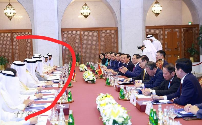 范明正与科威特首相的会谈现场也太有意思了!越南方面都是西装革履、头发乌黑乌黑的。反观科威特这边,齐刷刷都是白袍,头上顶着一个圈,而且完全看不到脸庞,连在右上角负责拍照的工作人员也是穿着白袍。看来他们这帮人的西装革履化任重道远!