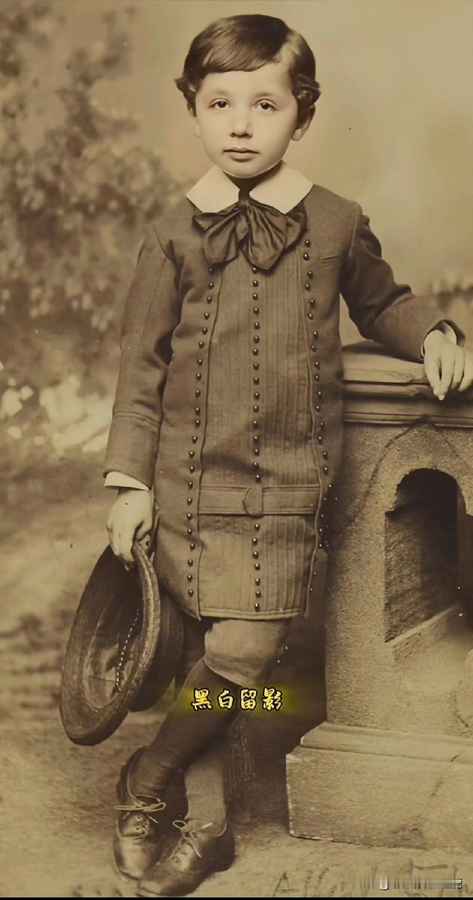 这是一张爱因斯坦儿5岁时的黑白照片,拍摄于1884年的慕尼黑,它定格了儿时爱因斯坦的珍贵瞬间。镜头前的他,脚蹬锃亮的皮鞋,呢子料外套的扣子扣得规规矩矩,浓密的黑发被细心梳成服帖的发髻,俨然一个恪守中产阶级教养规范的犹太少年。他那双日后将洞察宇宙奥秘的眼睛,此刻正带着些许拘谨望向镜头。 据说爱因斯坦他3岁才学会说话,童年时语言表达和思维反应都比同龄人迟缓。所幸,他成长于一个充满知识与艺术气息的家庭环境。父亲只是个收入中等的电气工程师,却在狭小的居所里堆满工程图纸和技术手册,母亲弹奏的钢琴声整日在公寓的各个角落回荡。 这个并不富裕的犹太小康之家,以独特的教养方式,为未来的科学巨匠搭建了成长的阶梯。 照片里整齐的着装和发型,正是那个尊崇知识又坚守传统的时代的缩影,包裹着一个正默默成长的非凡灵魂。