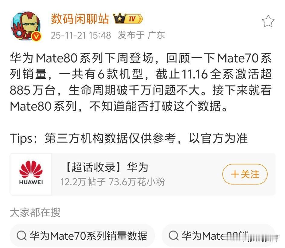 华为mate70系列销量超885万台,冲击一千万台销量,这个速度比mate60系列还是慢许多的,但是破一千万台也只是时间问题,看看这次升级比较大的mate80系列到时候首销期情况如何[灵光一闪]后续肯定也有优享版的,70系列一共就有6款机型