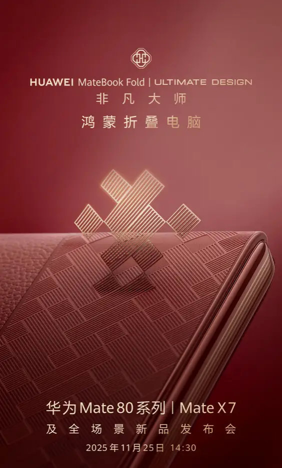 【鸿蒙折叠电脑华为MateBook Fold非凡大师新颜色官宣:11月25日见!】华为终端官方宣布,鸿蒙折叠电脑华为MateBook Fold非凡大师新颜色将于11月25日14:30发布。官方预热海报以“瑞红登场,再展非凡”为宣传语,预示这款折叠屏电脑将迎来全新配色。值得一提的是,该产品已提供锻影黑、天际白、云水蓝三种配色。此次发布是华为在折叠屏电脑领域的进一步拓展。早在2025年5月,华为就首次推出了MateBook Fold非凡大师,作为全球首款鸿蒙折叠屏电脑,它便以创新的形态和系统引发了行业关注。据悉,华为MateBook Fold非凡大师在华为产品线中定位高端旗舰。此前,该款产品的首发价格为23999元起,瞄准高端商务和专业创作人群。官方信息显示,华为MateBook Fold非凡大师采用华为自主研发的玄武水滴铰链技术,该铰链采用锆基液态金属材料主轴,结合三段式榫卯阻尼架构转轴。该铰链实现了水滴形态的闭合无缝设计,不仅解决了折叠屏的折痕问题,还支持30度-150度无极悬停。机身方面,该产品展开时单面最薄处仅7.3mm,重量约1.16kg。屏幕方面,华为MateBook Fold非凡大师采用18英寸双层OLED柔性屏,支持3.3K分辨率和1600尼特峰值亮度,屏占比高达92%。值得一提的是,华为MateBook Fold非凡大师在上市后市场表现亮眼。该产品上市首月即占据2万元以上笔记本市场73%份额。同时,华为在折叠屏技术领域投入大量研发资源,布局了2700多项核心专利。截至2025年11月,鸿蒙电脑适配应用已突破2000款,覆盖创设、金融等多个专业领域。