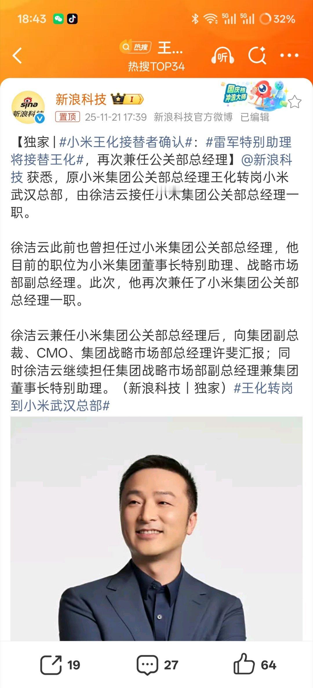 【小米王化“接替者”确认:雷军特别助理徐洁云再次兼任公关部总经理,2020年徐洁云升职了,让王化当接替公关部,现在又回去了?】原小米集团公关部总经理王化转岗小米武汉总部,由徐洁云接任小米集团公关部总经理一职。之前徐洁云升职了,让王化当接替公关部,现在又回去了??徐洁云此前也曾担任过小米集团公关部总经理,他目前的职位为小米集团董事长特别助理、战略市场部副总经理。此次,他再次兼任了小米集团公关部总经理一职。据悉,王化的新职位为小米武汉区域总部综合管理部总经理,将向武汉区域总部总经理王扉汇报。徐洁云兼任小米集团公关部总经理后,向集团副总裁、CMO、集团战略市场部总经理许斐汇报;同时徐洁云继续担任集团战略市场部副总经理兼集团董事长特别助理。:,