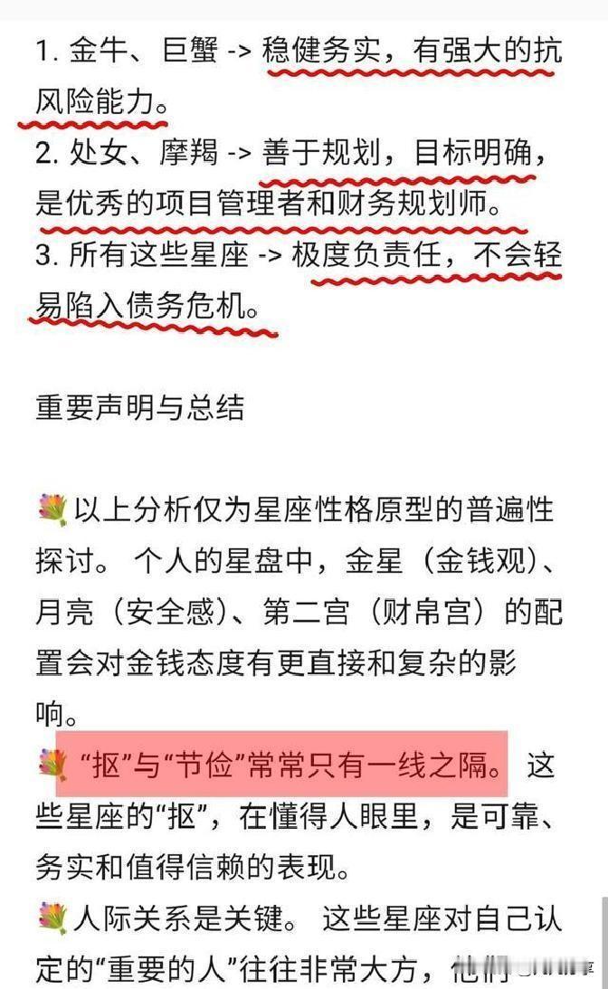 一提到谁最会省钱,很多人第一反应都是那几个星座。别看平时都挺大方,真涉及到花钱,每个都有自己的小算盘。 金牛座排在前头一点不意外。他们从来不冲动消费,买东西先对比再下手,宁愿多花点时间查资料,也不愿多花一块钱冤枉钱。在他们眼里,钱是辛辛苦苦攒出来的,每一笔都得看得见回报。 处女座就更细致了,连日常开支都要做计划表,今天花了多少、这个月还剩多少,心里都有数。看上去有点“抠”,其实是一种强迫式理性,靠着这股劲儿,很多处女座在存钱和理财上成绩都不差。 巨蟹座省钱,更多是为了家。对外出手谨慎,能省则省;但只要是家人、孩子、父母需要,立马变得很大方。钱在他们心里,是给家人安全感的底气。 摩羯座则把钱当成实现目标的工具。表面上看不爱花钱,其实是在默默攒资金,等到关键时刻,愿意为事业、提升自己砸重金,绝不手软。 看下来就会发现,这几个星座的“抠”,本质不是小气,而是有规划、有取舍地用钱,算得清,也守得住。至于谁才是真正的省钱王,答案恐怕各有各的理由