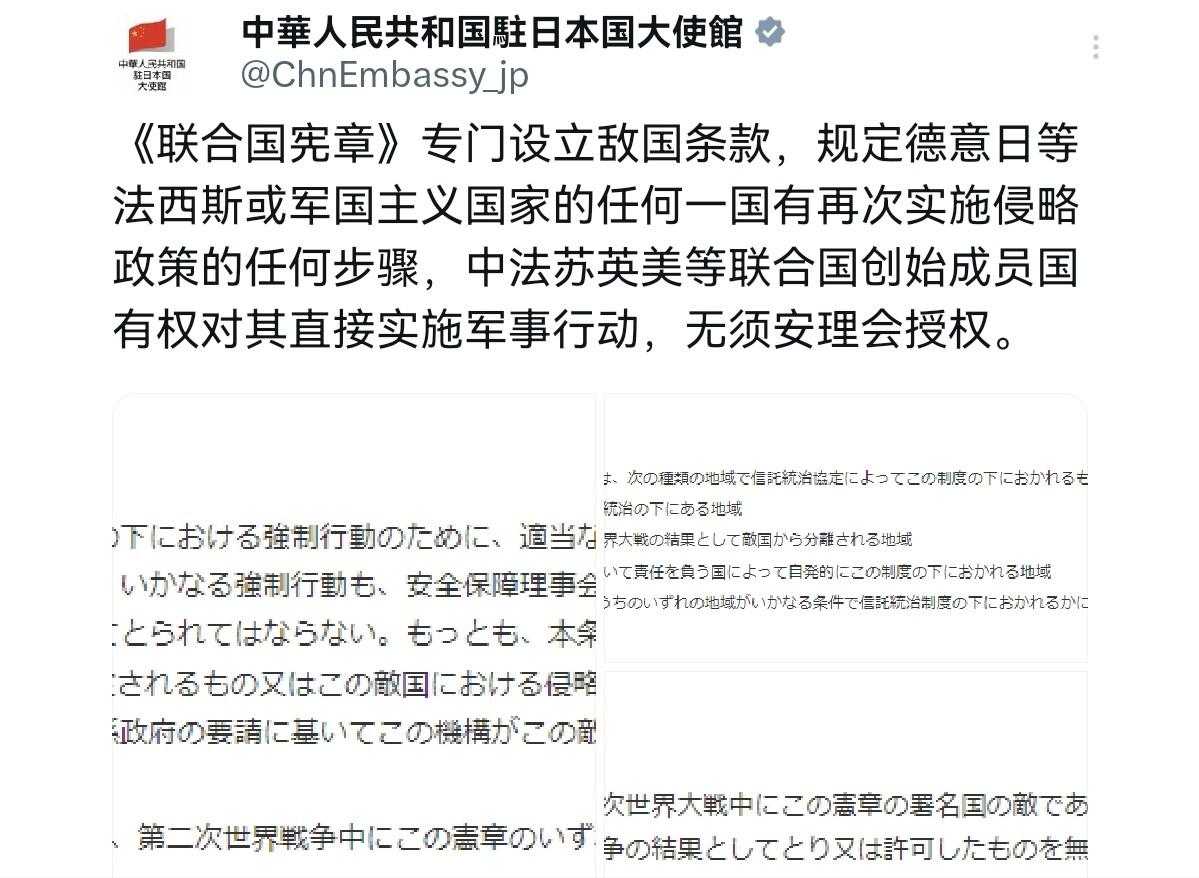 摊牌了!这次我们大使馆说得很清楚,驻日大使馆发文称:《联合国宪章》专门设立敌国条款,规定德意日等法西斯或军国主义国家,任何一国有再次实施侵略政策的任何步骤,中法苏英美等联合国创始成员国,有权对其直接实施军事行动,不需要安理会授权。 之前暗示日本装没听见,现在大使馆这话够直白了吧,也就是说,任何军事扩张或干预台湾问题的举动,都将触发宪章赋予的合法反击权利。这一表态不仅是对日本国内右翼势力的警示,也是向国际社会表明中国维护地区和平的坚定立场。 这才是真正的'以法服人',用国际法说话,比任何抗议都更有力量 日本近来在军事部署、防卫预算、台海议题上的系列动作,确实正在触及这条法律红线。而且高市早苗在被外交部驳斥后,依然坚称台湾问题立场没有改变,这是准备死扛到底了! 不禁让人想起"故态复萌"这个成语。就像丘吉尔警告的"忘记历史的人注定重蹈覆辙",日本部分政客似乎正在遗忘沉痛教训。 日本政客该醒醒了,别以为抱紧美国大腿就能为所欲为,历史不是你想改就能改的,历史教训血淋淋,希望日本能听进去,别让历史悲剧重演。 日本如果聪明,就该收敛点,否则“玩火自焚”是迟早的事。中国这么做,既展示了负责任大国的担当,也给世界提了个醒:和平需要共同守护,谁破坏谁就得买单。胆敢以身犯险,就要做好被彻底清算的准备。