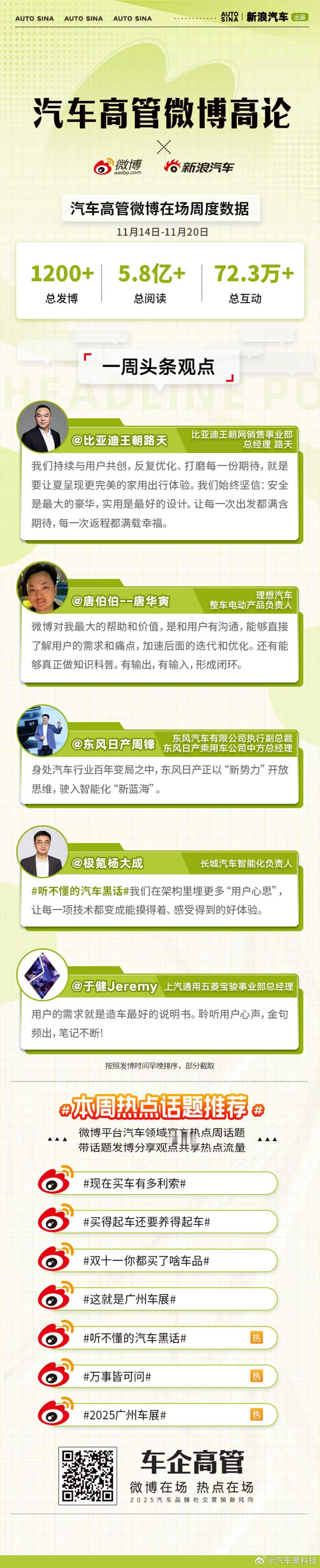 与用户共创、聆听需求,让技术更实用、体验更温暖。汽车高管微博高论,省流速览微博一周高管精彩观点!