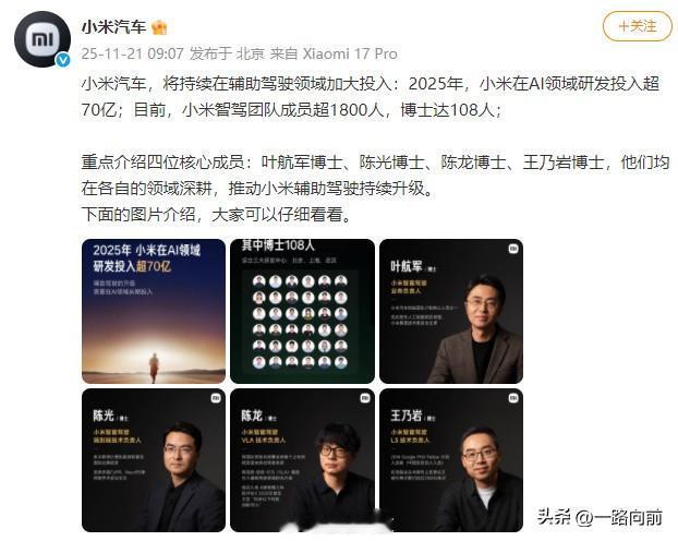 小米在智驾领域是真要all in啊!2025年AI研发直接砸超70亿,智驾团队扩到1800多人,光博士就有108位,这配置放在行业里都相当能打,雷军这是铁了心要在智能驾驶赛道杀出重围! 可能有人没概念,108位博士是什么概念?相当于把智驾领域的“学霸天团”直接打包,而且核心成员全是业界大牛——总负责人叶航军博士是行业老兵,陈光博士专攻端到端技术,王乃岩博士带队冲L3级智驾,陈龙博士聚焦可变车道自动驾驶,每一位都是能扛大旗的角色。再加上70亿真金白银的投入,不管是算力集群搭建,还是千万级场景数据训练,都有足够底气支撑。 而且小米智驾已经拿出了实打实的成果:SU7的端到端泊车大模型太香了,5cm精度能泊进极窄车位,23km/h代客泊车速度比特斯拉快3倍;今年升级的HAD 2.0系统,还能全自动过闸机、200米漫游寻位,全国地级市都能开城市NOA,甚至加了暴雨模式提升极端天气可靠性。这波投入不是空谈,而是真的在落地到用户体验里。 不过有一说一,之前懂车帝实测也暴露了一些短板,比如高速识别静止障碍物、城区识别儿童假人还有提升空间。但换个角度想,哪个车企的智驾不是边投入边迭代?小米敢砸这么多钱和人才,至少能看出诚意,而且现在智驾行业竞争多卷啊,华为ADS、比亚迪天神之眼都在发力,小米这波重仓相当于给用户吃了颗定心丸——后续OTA升级只会越来越强。