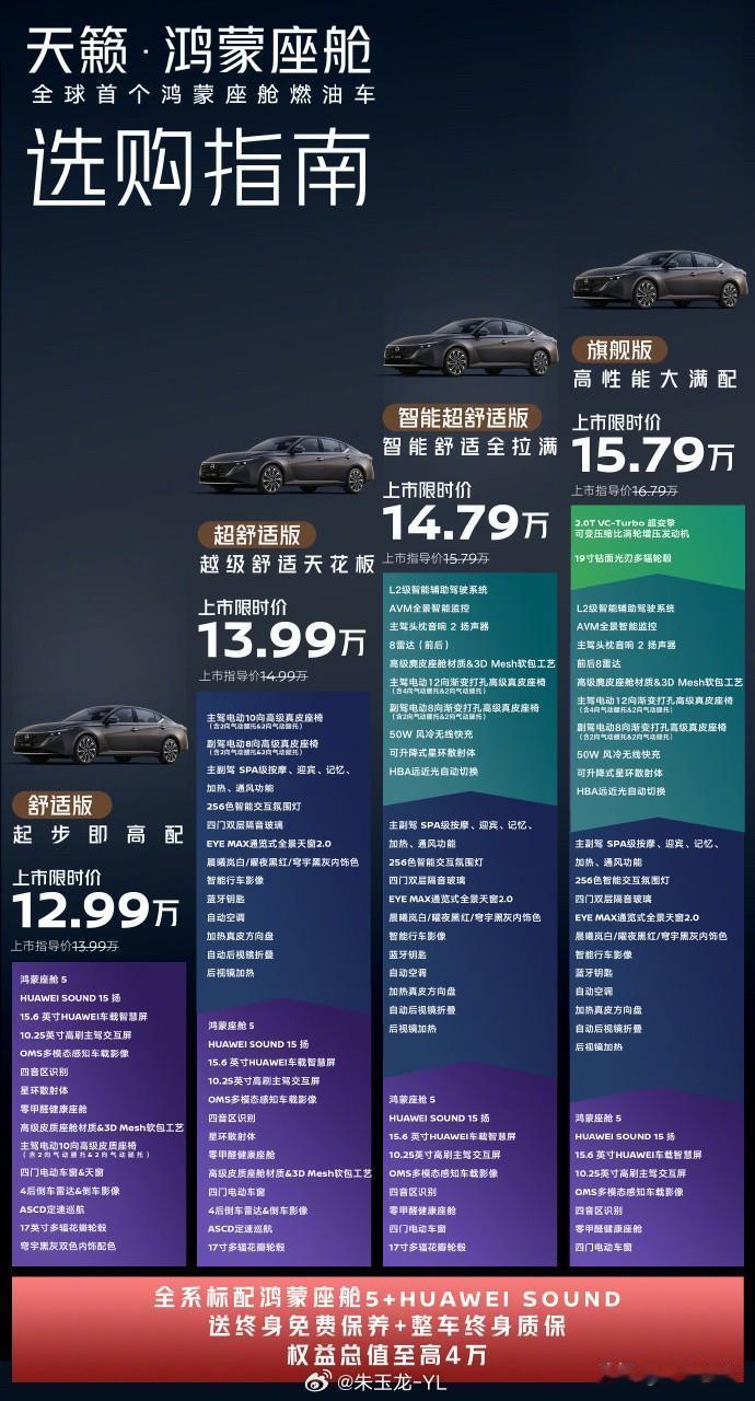 日产天籁掀桌了!12.99万 广州车展重磅新车,或者说是趋势是今年燃油车智能化,选择了路径最短的路线,拿鸿蒙座舱特别是鸿蒙座舱5来补齐短板。 以前总吐槽燃油车车机是“老年机”,反应慢、功能少,结果天籁直接釜底抽薪——不搞复杂研发,直接抱上华为大腿,全系标配鸿蒙5系统!鲁大师实测数据说话,车机流畅度杀进全车型前15,紧随小米YU7、小鹏G6这些新势力电车,导航规划响应、座椅调节时延还拿了第一,比很多豪华燃油车都快,用着跟手机一样丝滑。 实测体验更是惊喜,语音控制支持普通话、粤语、四川话,说“打开座椅加热”“导航到广州塔”秒响应,四音区识别超准,后排说话也能精准捕捉。华为超级桌面太实用,手机碰一下就能把导航、音乐同步到车机,微信、抖音也能直接装,再也不用忍受老车机的卡顿折磨。再加上HUAWEI SOUND音响,放首歌跟置身音乐厅似的,燃油车也能有智能移动座舱的体验! 12.99万的入门版就有鸿蒙座舱+日产“大沙发”,2.0L动力加CVT变速箱,市区代步平顺又省油,加92号油就行。中配13.99万还多了通风/加热/按摩座椅,后排空间三拳多,175cm身高躺平无压力。对比同级凯美瑞、迈腾,入门价直接低3-4万,还送终身免费保养+整车终身质保,后期用车成本直接砍半,这性价比谁顶得住? 不得不说天籁这次找对了路子,燃油车用户想要的无非是省心+不妥协智能,它直接用“B级车空间+华为智能+A级车价格”戳中痛点,堪称“新势力燃油车”标杆。既保留了燃油车的可靠性,又补齐了智能化短板,这波操作比盲目堆配置实在多了!