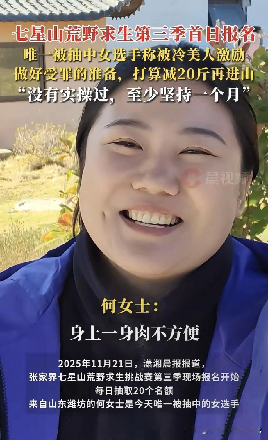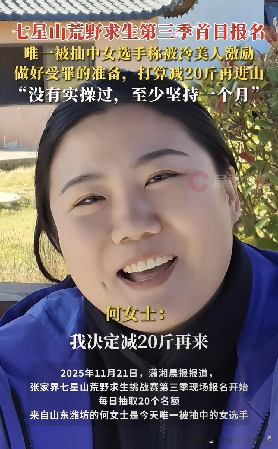 荒野求生第三季:女选手是来减肥的 七星山荒野求生报名首日,山东潍坊的何女士成了唯一抽中的女选手——她笑着说“先减20斤再进山,一身肉不方便”,还放话“没实操过,至少坚持一个月”。 评论区直接炸了:有人调侃“这节目成减肥营了?美女是冲瘦下来来的”,但也有人较真“荒野求生靠的是技能,减体重是减‘储备粮’吗?” 镜头里她笑得敞亮,说“做好受罪准备”,可底下已经吵成两派:有人觉得“减体重是为了更灵活,没毛病”,但老粉皱眉“前两届颁奖干饭,这季连减肥都安排上了,求生的魂去哪了?” ——你觉得:女选手先减肥再求生,是理智准备还是把荒野赛变成了“变美局”?