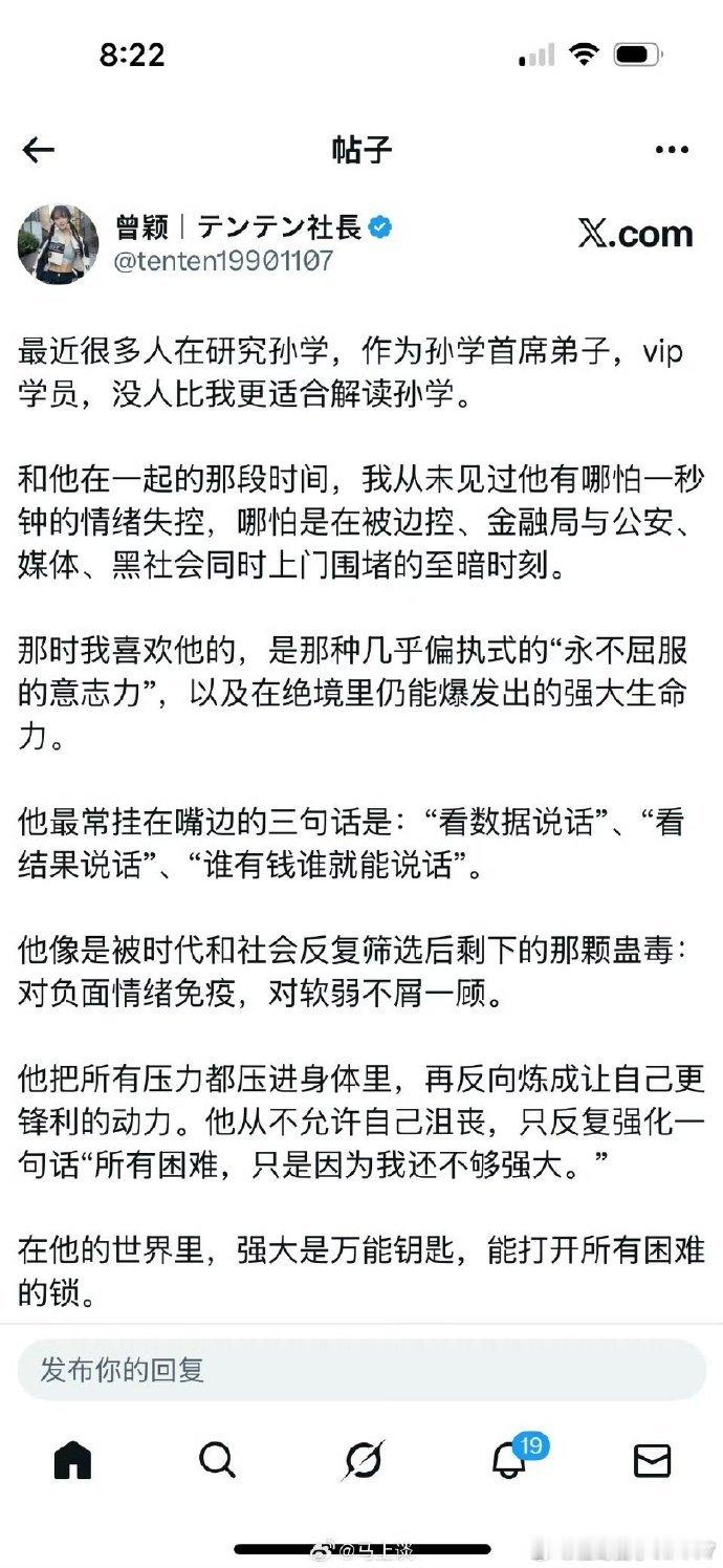 孙割前女友曾颖再谈孙宇晨:最近很多人在研究孙学,作为孙学首席弟子,vip学员,没人比我更适合解读孙学。和他在一起的那段时间,我从未见过他有哪怕一秒钟的情绪失控,哪怕是在被边控、金融局与公安、媒体、黑社会同时上门围堵的至暗时刻。那时我喜欢他的,是那种几乎偏执式的“永不屈服的意志力”,以及在绝境里仍能爆发出的强大生命力。他最常挂在嘴边的三句话是:“看数据说话”、“看结果说话”、“谁有钱谁就能说话”他像是被时代和社会反复筛选后剩下的那颗蛊毒对负面情绪免疫,对软弱不屑一顾。他把所有压力都压进身体里,再反向炼成让自己更锋利的动力。他从不允许自己沮丧,只反复强化一句话“所有困难,只是因为我还不够强大。”在他的世界里,强大是万能钥匙,能打开所有困难的锁。