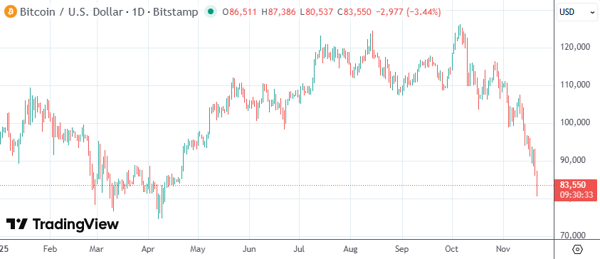 财联社11月21日讯(编辑赵昊)据Bitstamp报价,周五(11月21日),比特币一度跌至80537美元,为4月份以来的最低水平;现反弹至83572美元,近24小时的跌幅接近8.5%,以太坊、瑞波币则跌超9%。
