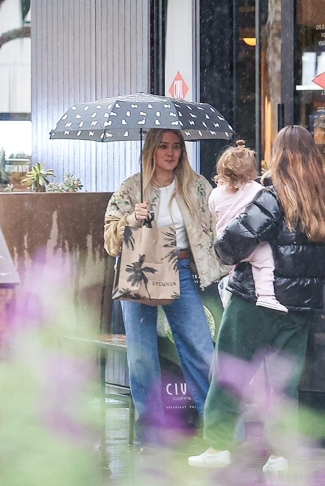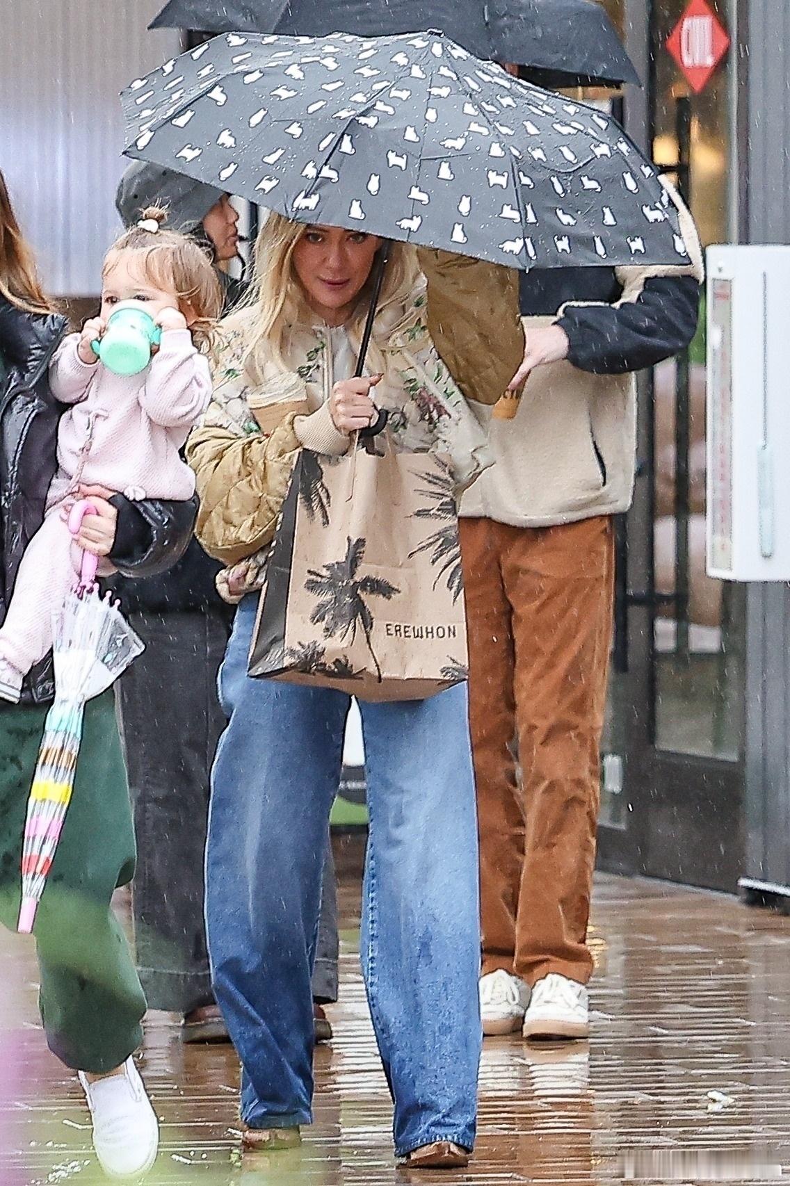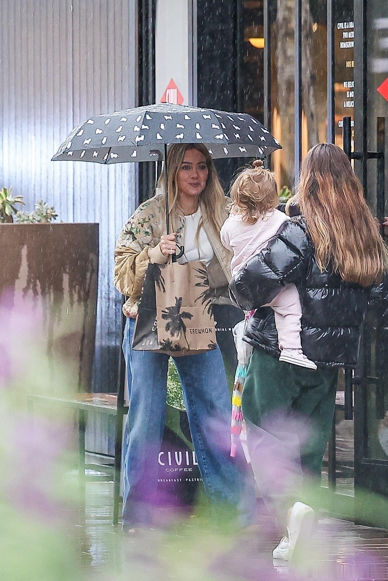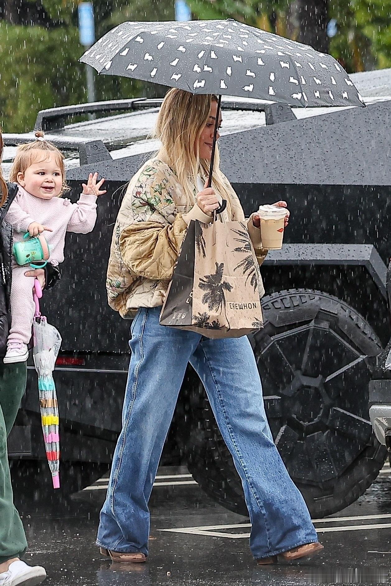 希拉里达芙在洛杉矶外出,冒着雨带着小女儿Townes到商场购物,哈哈哈达芙自己打