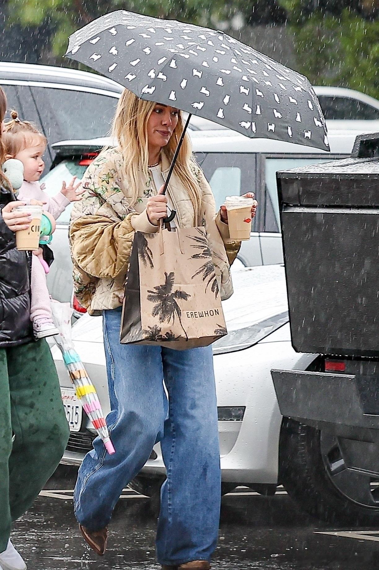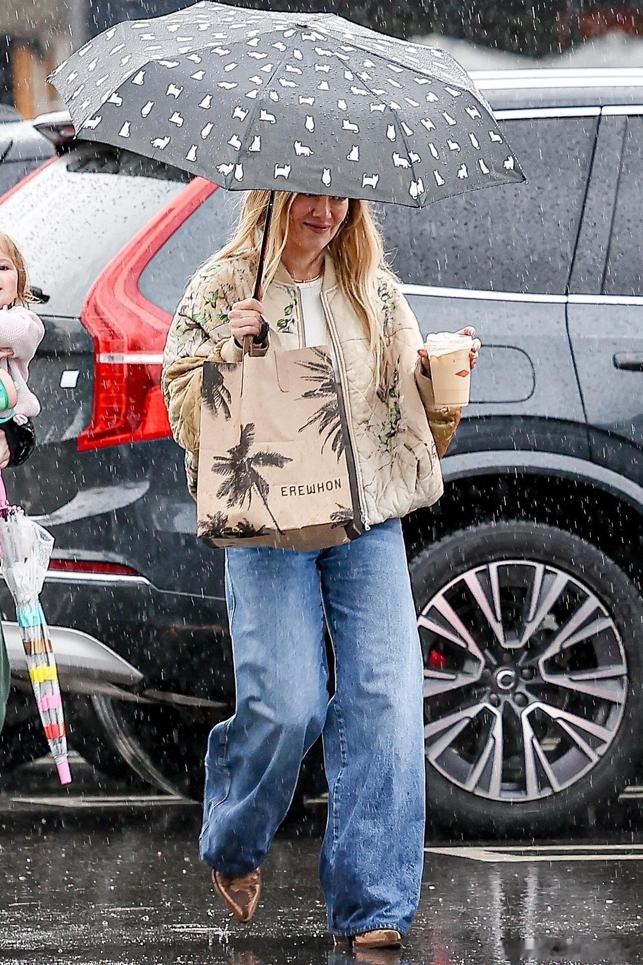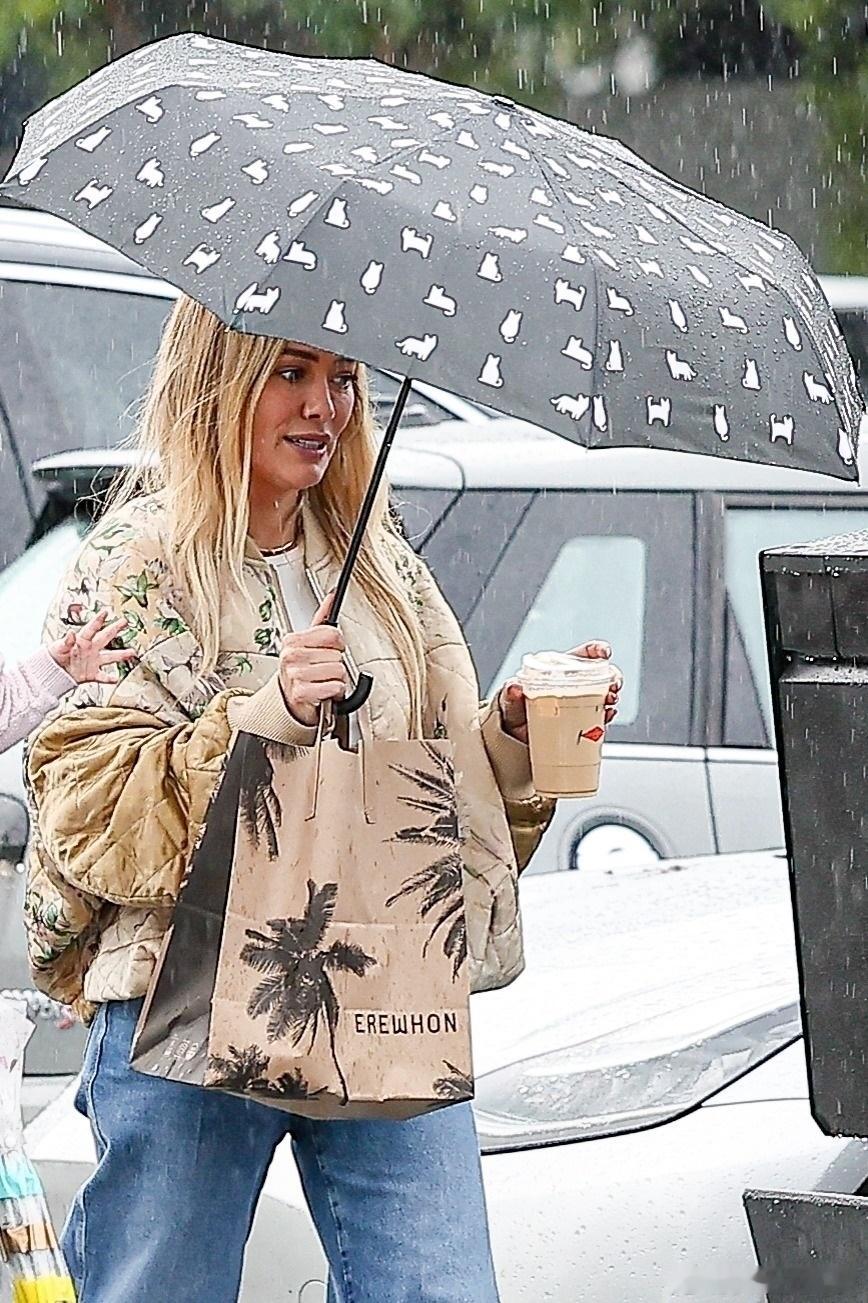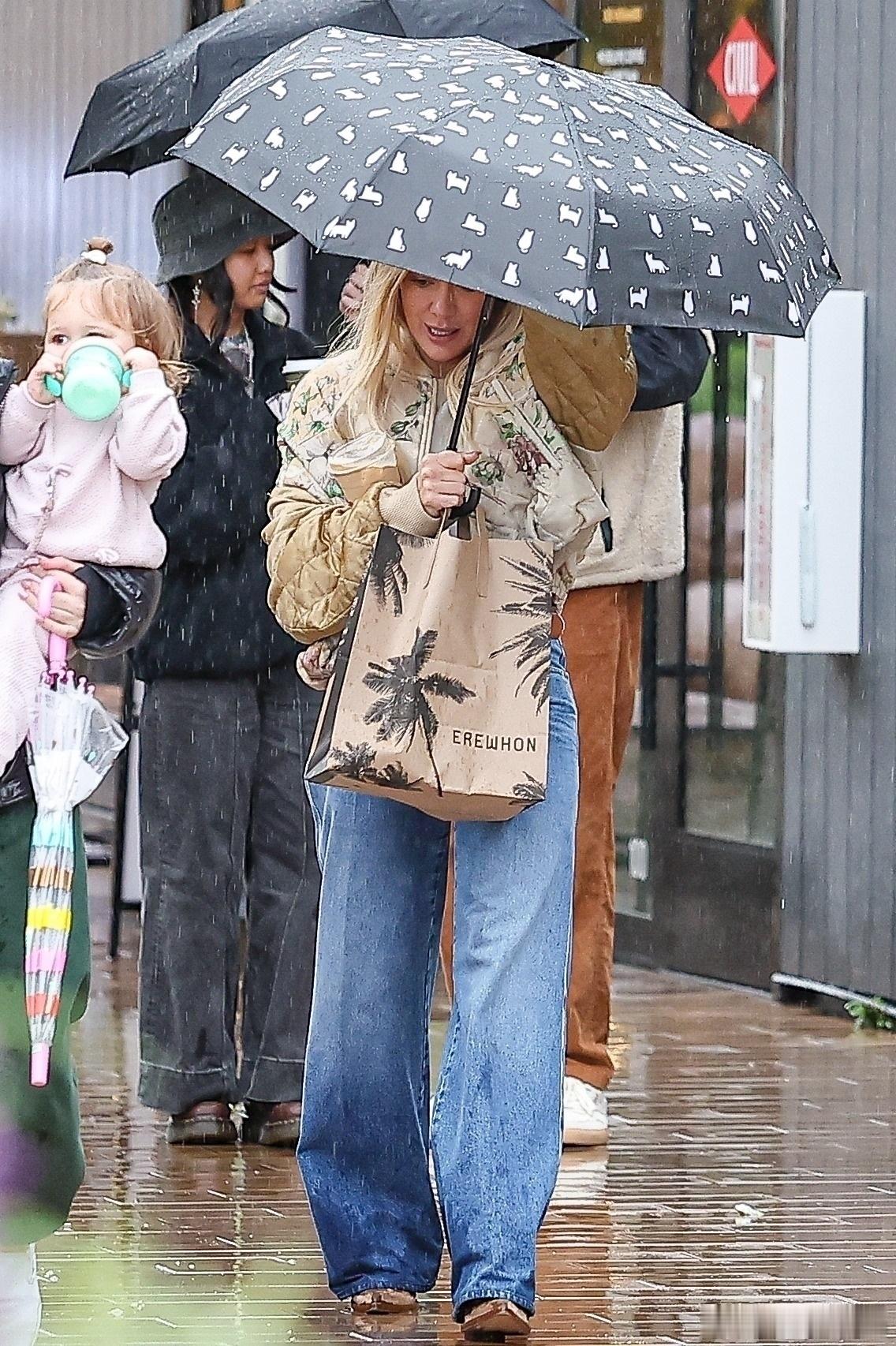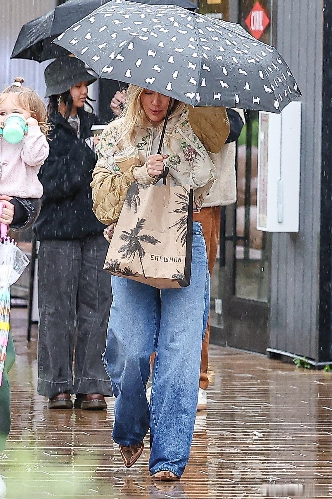 希拉里达芙在洛杉矶外出,冒着雨带着小女儿Townes到商场购物,哈哈哈达芙自己打