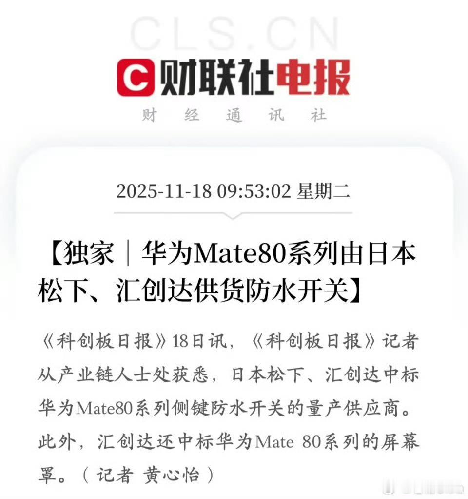 财联社这是几个意思?老余前脚刚刚官宣华为mate80,它后脚就开始挑事!不就是一个小小的防水开关吗?用日本产的怎么了?不行吗?你看看其他国产手机,零部件不止一个是外国的吧!满大街的日系车你也不是看不到,华为好不容易摆脱了卡脖子的技术瓶颈,你又搁这儿煽风点火,谁家不是供应链技术?在手机领域,华为算是去外化最好的了,99%的零部件都是国产!你拿一个小小的开关说事,明显就是居心不良!