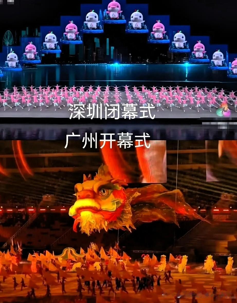 在广东举办的这次活动,开幕式是广州举办的,闭幕式是深圳举办的。总体来说,开幕式更胜一筹,闭幕式有点随意。开幕式上有不少值得借鉴的地方,闭幕式上有些地方让人难以理解。开幕式上将传统文化与现代科技相结合,做得非常成功。 特别是中式审美的鳌鱼一出场,就震撼全场,给人留下了深刻的印象。闭幕式上也有将科技与文化相结合的地方,但不知是因为时间关系还是其他什么原因,给人一种拼凑的感觉。闭幕式的开场就是一组广播体操,真的是让人难以理解。