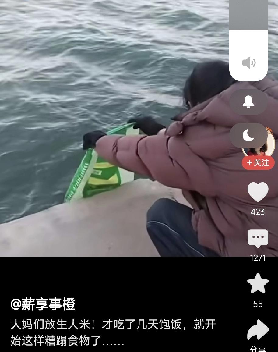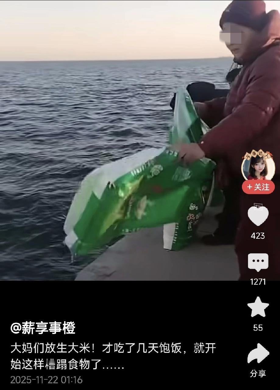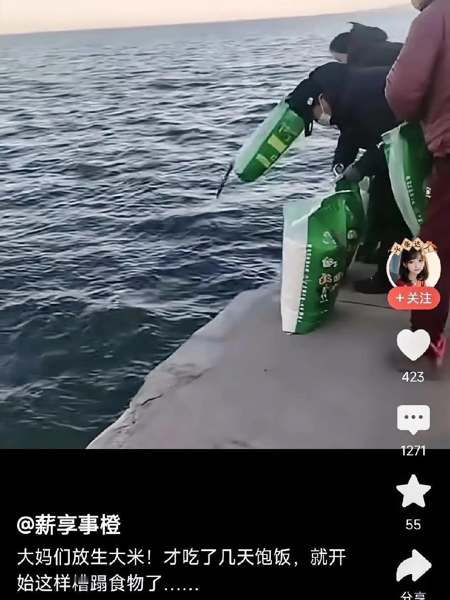 “放生大米”?奇葩! 现在的奇葩事,真是层出不穷啊! 刚刚看到一个视频,几个老年人正在水边“放生大米”…… 放生,这是佛教里的概念,源于佛教慈悲理念,将捕获的动物(如鱼类、鸟类、龟类等)放归自然的行为,核心是尊重生命,减少杀戮…… 看看这些老人,连“放生”为何都不懂,居然把从商店买来的一袋袋大米倒进了水塘里,说这是在“放生”…… 你说说,这是奇葩,还是愚蠢?