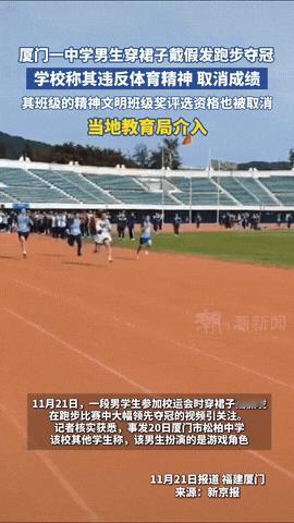 福建厦门,一中学男生参加学校运动会,穿着裙子、戴着假发跑步,一举夺冠,遥遥领先其他参赛选手,可兴奋劲还没过,后面却被学校取消成绩,理由是其穿裙子戴假发违反了体育精神,男生所在班级因为给男生拉了横幅加油助威,也被取消了精神文明奖评优资格! 11月20号,厦门市松柏中学的校运会赛场上,发生了一件让人争论不休的事情,一名男生戴着黄色假发、穿着裙子站上了跑道,要参加男子组的跑步比赛。 发令枪响后,这男生跑得飞快,冲刺阶段更是拼尽全力,把其他选手远远甩在身后,第一个冲过终点线。 冲线瞬间,他还顺手摘下了头上的假发,看得出来,戴着那玩意儿跑步确实不太习惯。 现场同学都挺激动,他所在的班级还拉着横幅给他加油,不少人都觉得这装扮挺有创意,是在扮演某个游戏角色。 可没人想到,这份兴奋劲儿没持续多久,学校就给出了处理结果,取消这个男生的冠军成绩,理由是他的着装违反了体育精神,就连他所在班级的精神文明班级评选资格也一并取消了。 消息一出来,不管是校园里还是网上,都炸开了锅。 支持男生的人不少,说他没用兴奋剂,也没作弊,实打实跑出来的第一,就因为穿得特别点就取消成绩,惩罚也太重了。 还有人说这是孩子的创作力,应该包容多元,没必要上纲上线。 但站在校方这边的人也有自己的道理,他们觉得体育比赛就得有体育比赛的样子,竞技运动得讲基本的形象规范。 这男生穿裙子戴假发,看着是好玩,可往深了说,这种男扮女装的装扮,很容易给其他同学造成误导。 中学生正处在三观形成的关键时候,对社会上的一些普遍认知还很朦胧。 要是这次没人管,下次说不定就有人扮成孙悟空翻着跟头跑,或者装成僵尸蹦着参赛,那赛场不成了游乐场,竞技的严肃性就没了。 有人可能会问,不就是个校运会吗,犯得着这么较真? 可校运会再非正式,也是有组织的集体活动,不是自家院子随便玩,更不是漫展现场可以自由cos。 漫展上大家拼造型、秀创意是应景,可赛场上的核心是“比”,比的是速度、耐力和拼搏精神,着装得体是对比赛的基本尊重,也是给所有参赛选手一个公平的环境。 不少人质疑学校赛前怎么没制止,赛后才取消成绩,但换个角度想,不管赛前有没有提醒,选手自己也该清楚场合。 就像去参加婚礼不能穿得太随意,去考试不能带违禁物品一样,不同的场合有不同的规矩,这是最基本的分寸感。 也有家长担心,这会扼杀孩子的个性,但是个性和规矩从来不是对立面,关键是要分清场合。 孩子想展示创意,完全可以在校园文化节、才艺表演这些场合,没人会反对,可在竞技赛场上,讲规矩不是束缚,而是对所有人的公平。 就像那男生要是穿着专业运动服夺冠,大家只会佩服他的实力,可加上这身装扮,就难免让人觉得有哗众取宠的嫌疑,也让其他认真备赛的选手心里不舒服。 现在教育局已经介入了,学校也说会发通告详细说明。 大家争论的核心,就是怎么在包容孩子个性和遵守规则之间找平衡。 孩子有创意是好事,但更得培养他们的场景意识,知道什么场合该做什么事,这不是压抑天性,而是教会他们对自己、对他人负责。 后来有人说,要是这男生跑了最后一名,学校还会取消成绩吗?这话更是带着恶意的揣测。 不管成绩好坏,着装违规的事实是一样的,规则面前不该有成绩高低的区别。 校运会的意义,不光是比出输赢,更要教会孩子遵守规则、尊重场合,这比拿冠军更重要。