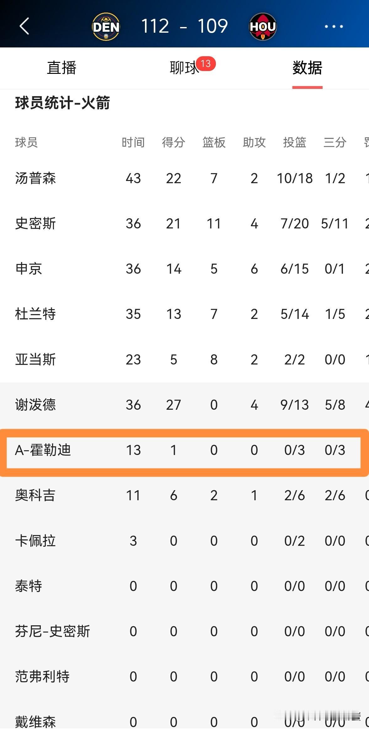 火箭大将霍勒迪真是神鬼莫测!今天火箭在主场以109:112输给了掘金,本场比赛霍勒迪未能延续上一场比赛的出色手感,他在替补出战的13分钟里,投篮3中0仅仅依靠罚球得到1分。 作为一名靠投篮吃饭的球员,霍勒迪最大的问题就是投篮稳定性太差,他总是神一场鬼一场。