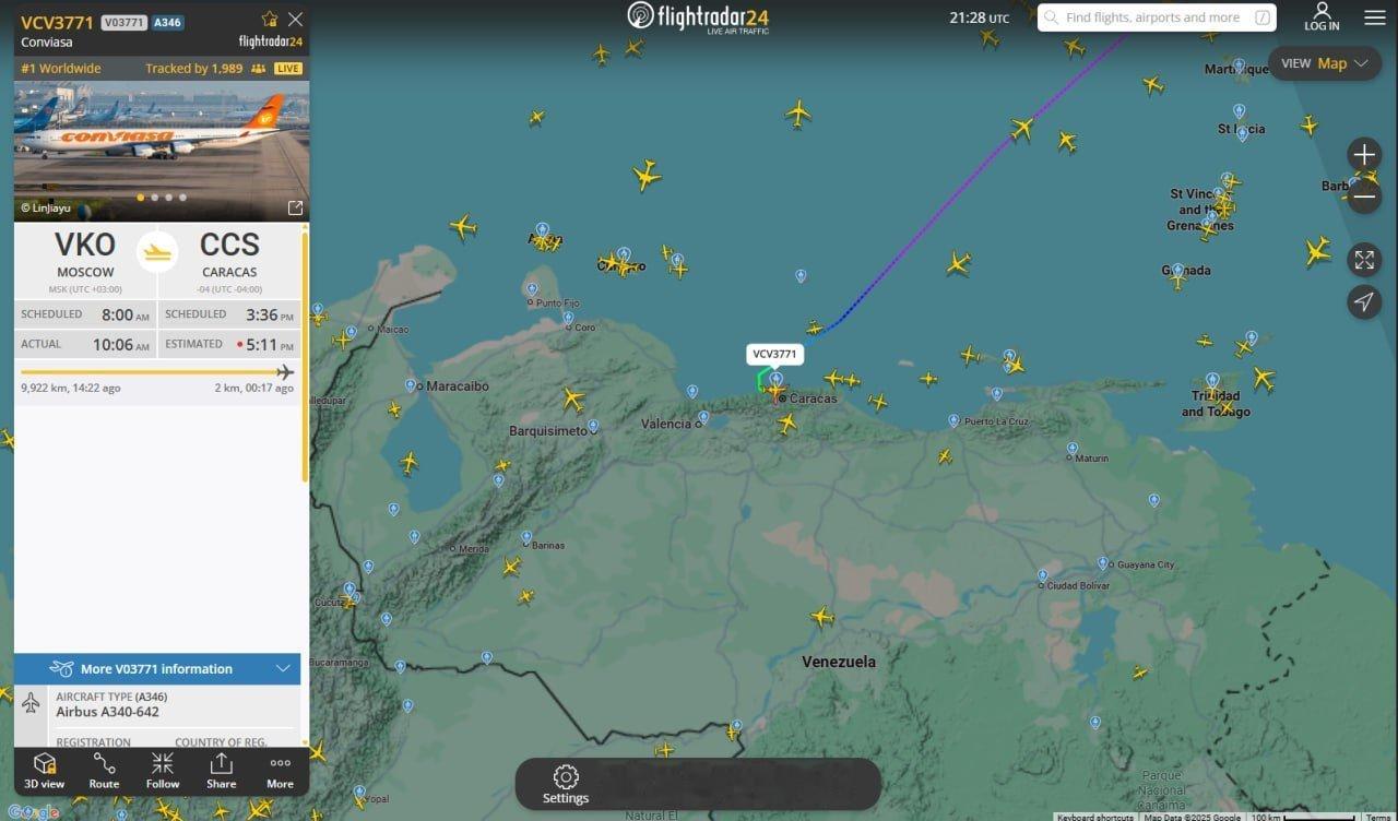 美国关闭委内瑞拉领空,民用飞机纷纷避开委内瑞拉领空。图一一架康维萨航空公司的空客 A340-642 从俄罗斯抵达委内瑞拉首都加拉加斯。图二