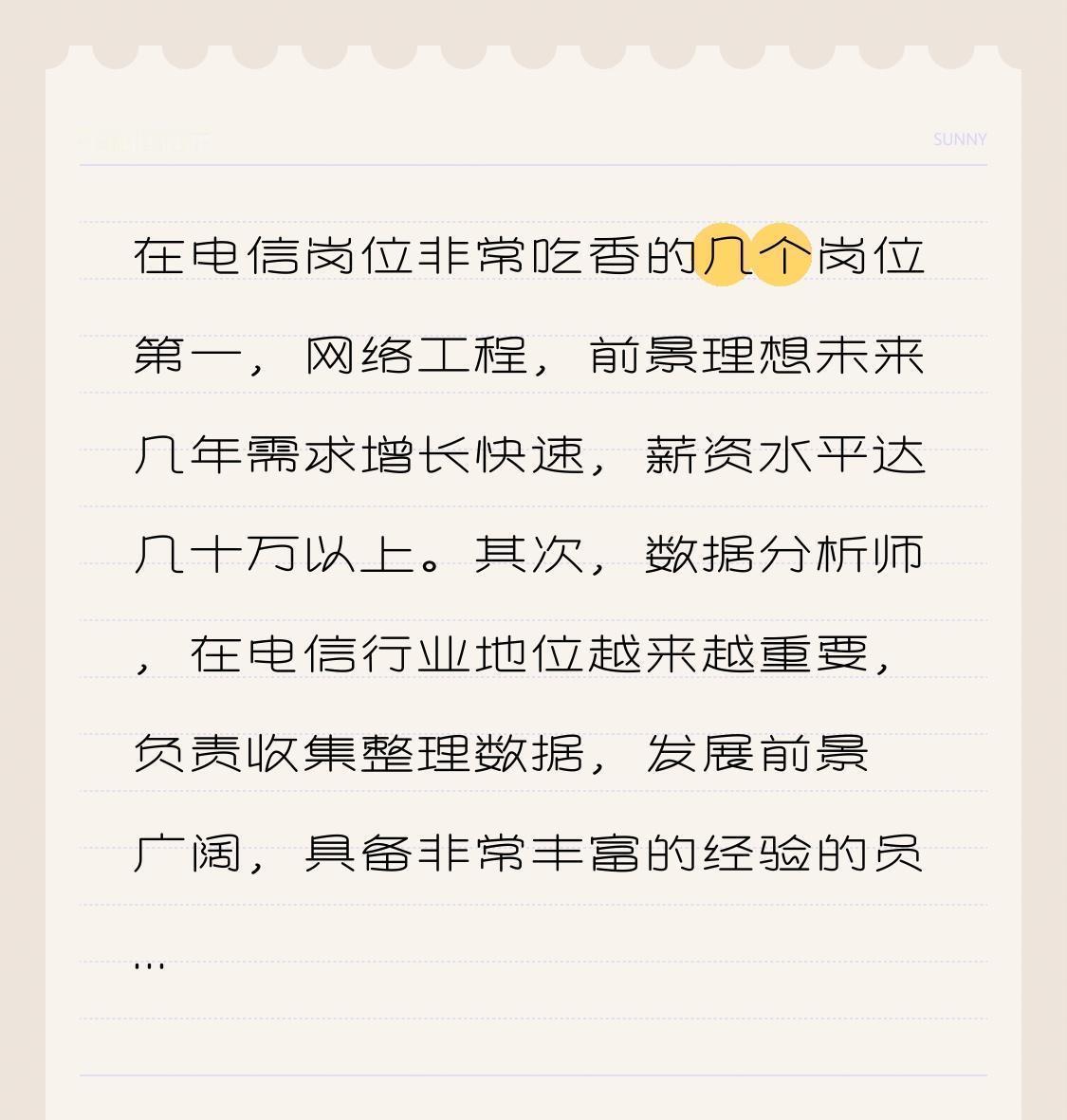 在电信岗位非常吃香的几个岗位 第一,网络工程,前景理想未来几年需求增长快速,薪资水平达几十万以上。 随着5G基站的广泛布局和6G研发的加速推进,电信行业正经历前所未有的技术迭代,这一过程中,具备核心技术能力的岗位逐渐成为人才市场的焦点。 网络工程师——作为电信网络的搭建者与守护者,其职责覆盖从基础设施建设到系统优化的全流程。无论是光纤网络的铺设,还是数据中心的维护,都需要他们具备扎实的技术功底和问题解决能力。 市场调研数据显示,未来五年内,随着智慧城市、工业互联网等应用场景的落地,网络工程领域的专业人才缺口将持续扩大。这一岗位的薪资水平也因此水涨船高,资深从业者年薪突破五十万已非个例。 在数字化转型的浪潮下,数据的价值日益凸显,数据分析师岗位因此迎来爆发式发展。与传统的数据分析不同,电信行业的数据分析师需要处理海量的用户行为数据、网络运行数据和业务运营数据。 他们不仅要具备数据清洗、建模的能力,更要能从复杂数据中提炼出业务洞察,为产品优化和市场决策提供支持。这种复合型能力要求,让该岗位在行业内的地位愈发重要。 对于具备丰富经验的数据分析师而言,其收入区间呈现明显的阶梯式增长——刚入行的新手年薪约在十万左右,而拥有五年以上工作经验、能独立完成大型数据分析项目的资深人士,年收入可达十几万到几十万,部分头部企业甚至开出百万年薪招揽高端人才。 产品经理则是连接技术与市场的关键纽带,在电信行业的产品创新中扮演着不可替代的角色。从初期的用户需求调研,到产品功能的规划设计,再到上线后的推广策略制定与持续优化,产品经理需要全程参与并主导。 这一岗位对从业者的综合能力要求极高,既需要懂技术逻辑,又要了解市场动态,还要具备出色的沟通协调能力。正因如此,优秀的电信产品经理在人才市场上具有极高的竞争力,往往成为各大企业争夺的对象。 电信行业的岗位热度,本质上是数字经济发展的必然结果。当通信技术从基础服务向智能应用延伸,行业对人才的需求也从单一技能型转向复合型、创新型。 无论是网络工程的技术深耕,数据分析师的数据洞察,还是产品经理的全局把控,这些岗位的吃香,都折射出电信行业在推动社会数字化进程中的核心作用——它们不仅是个人职业发展的优质选择,更是支撑数字中国建设的重要人才基石