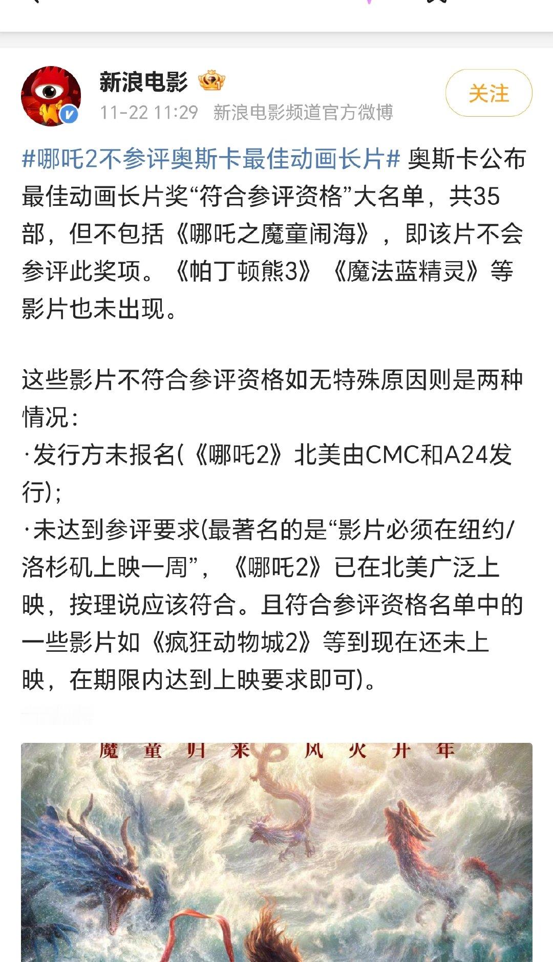 其实有点意外,哪吒2如果参选,虽然不知道能不能进最后五个候选提名,但至少可以进候选长名单吧,毕竟每年很多质量一般的都能进去,还是说奥斯卡需要跑颁奖季和公关,哪吒2项目组觉得不需要浪费钱了?但明明是a24发行的,按理说a24应该会报名。