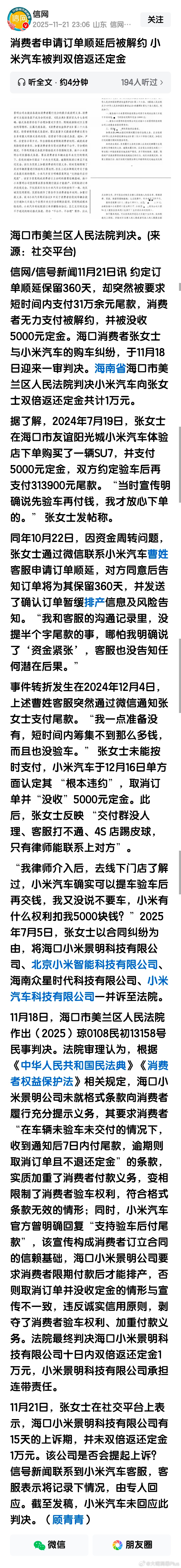 这个判决为其他交付了定金的消费者提供了判例……