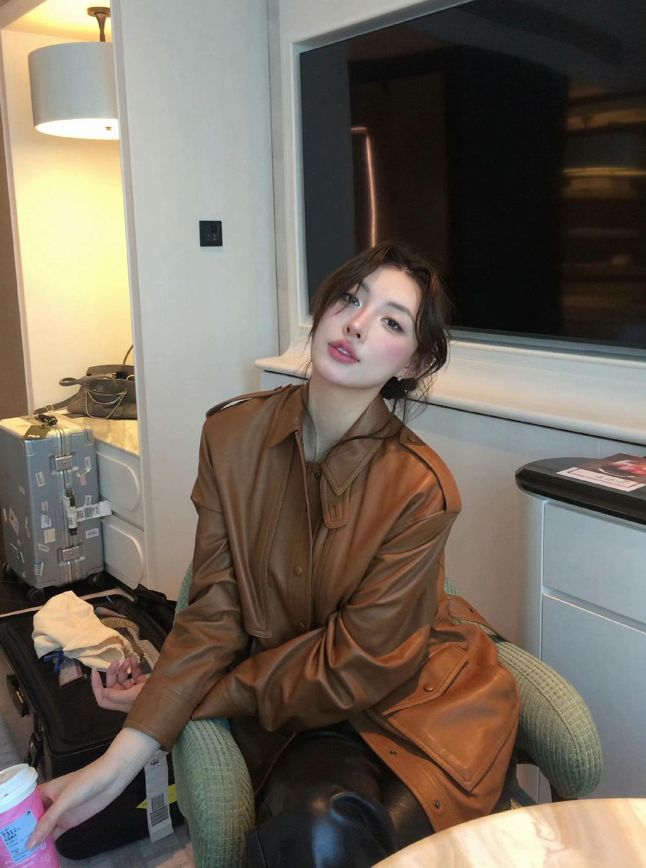 秋日暖阳下,落叶纷飞,时尚女孩倚树而立,尽显优雅与温暖。