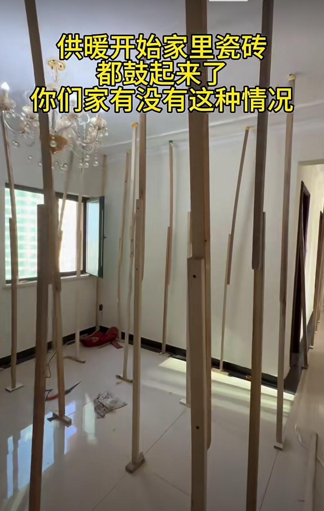 “暖气一供应,贴的地砖就会崩起来”,业主们常常提及这种情况。有的业主一遇到这种现象,就会像画面中那样找人用方木料顶着,可这终究只是治标不治本。毕竟,贴地砖所用的水泥砂浆时间久了会出现冷胀热缩现象,暖气开启后,若预留的缝隙过小,地砖就会开裂崩起。 其实,若想避免此类现象再次出现,最好的办法是将早前翘起的地砖换掉,重新铺贴。不过,这次预留的瓷砖缝要大一些,打底的砂浆也要更疏松,而且最后使用的美缝剂,要选用专防暖气崩瓷的柔性美缝剂,如此便能有效避免崩瓷问题。 冬日生活打卡季