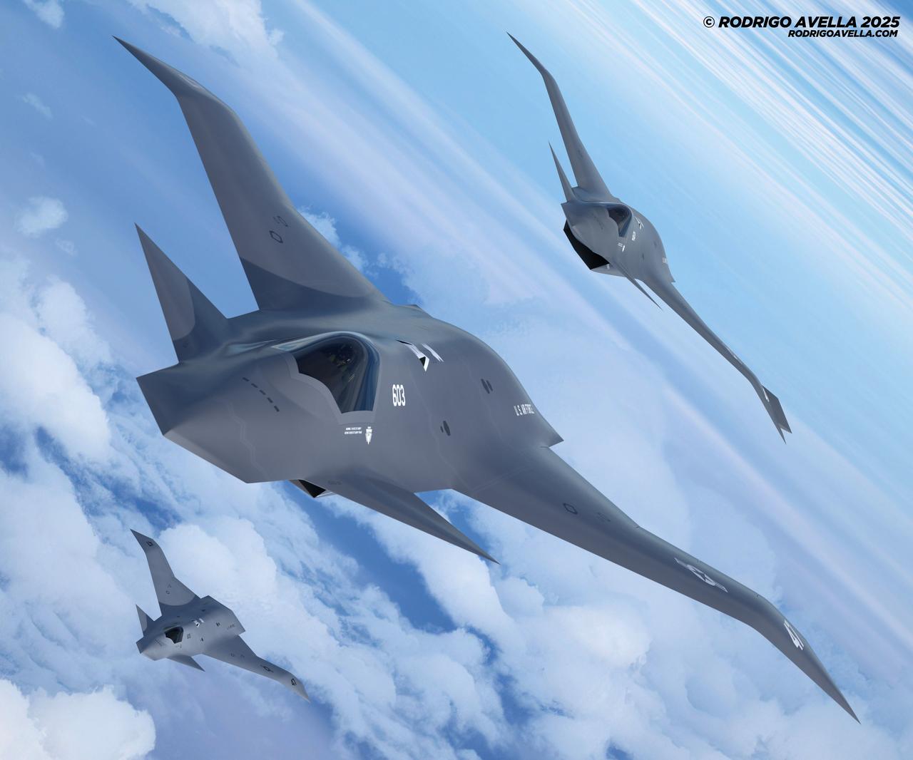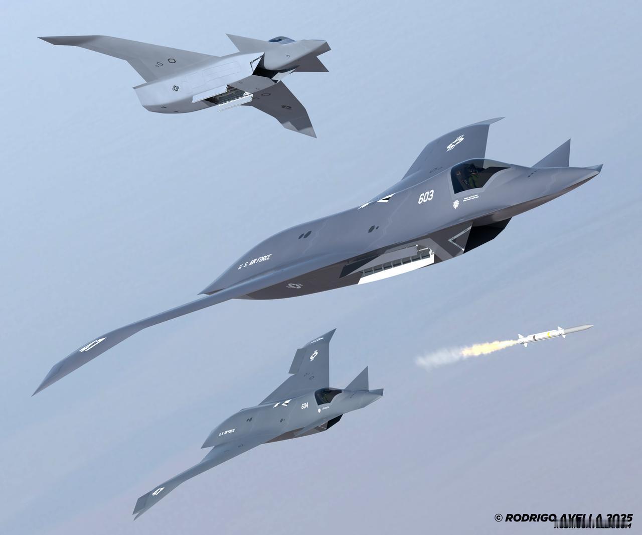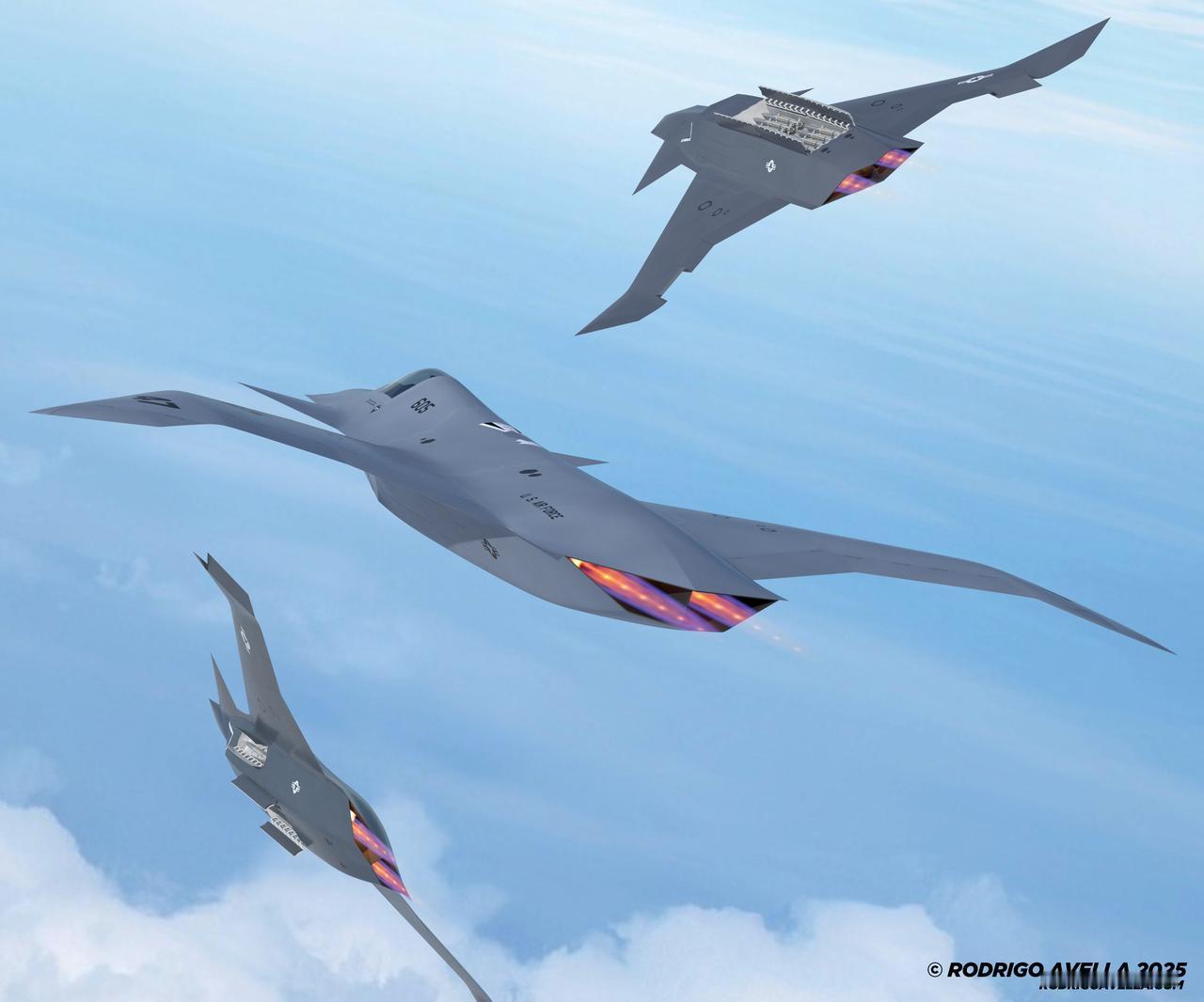 在最终的F-47外形公布之前,罗德里戈·阿韦拉根据麦克唐纳·道格拉斯公司2409型模型研究,绘制的F-47战斗机可能的外观效果图。