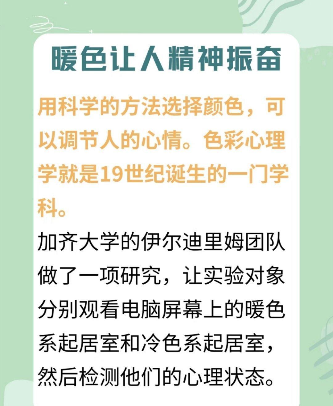 用科学心理学的方法选择颜色,可以调节人的心情,暖色让人精神振奋。色彩心理学诞生于19世纪,实验显示,看完暖色系的后,实验对象的反应是“心情舒畅”“精神振奋”。那么,暖色冷色如何区分,哪些色彩属于暖色呢?如果穿暖色的羽绒服,看上去更暖和,的确是符合心理科学的