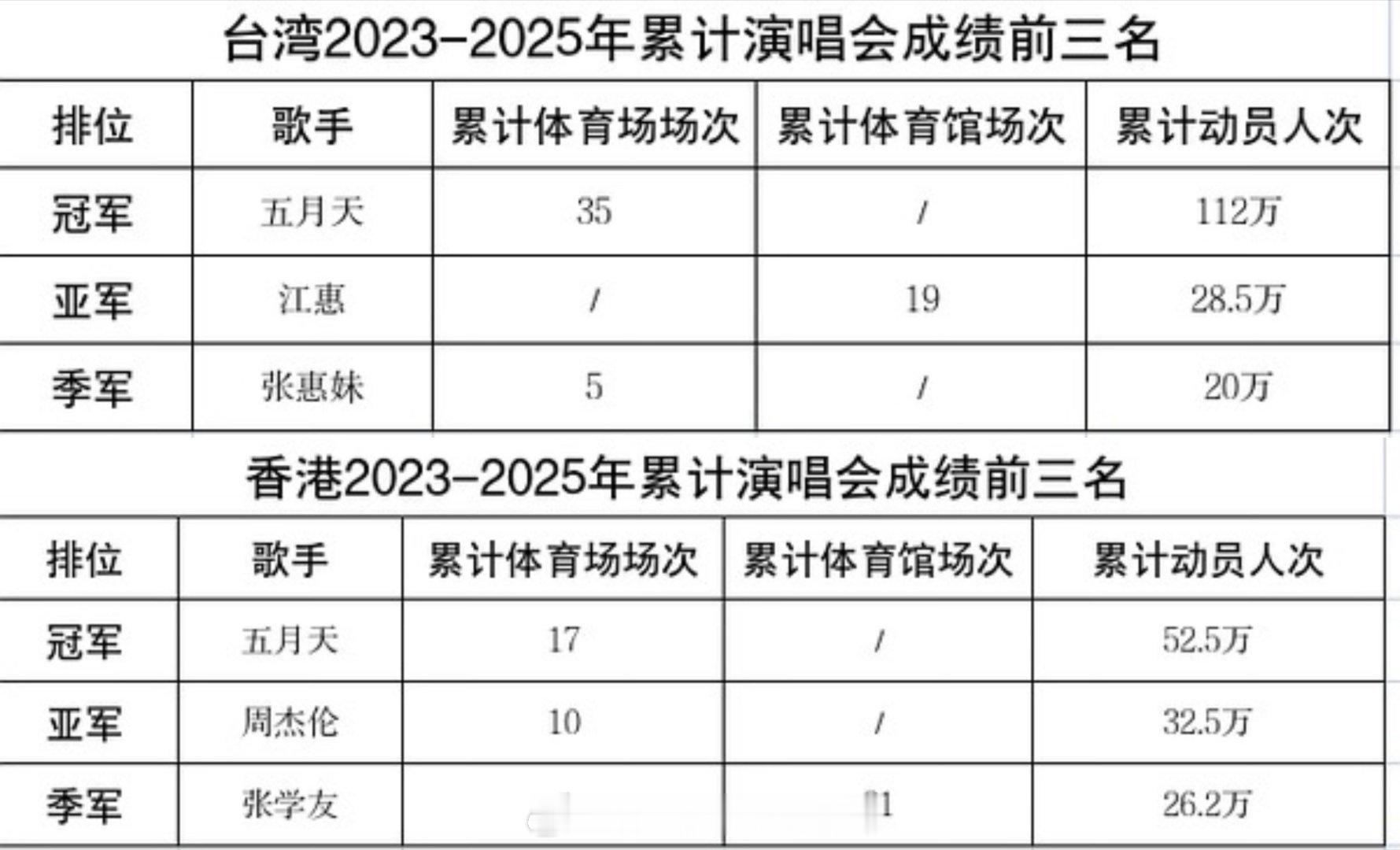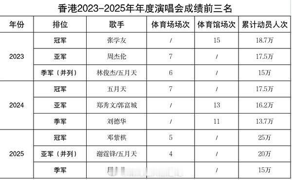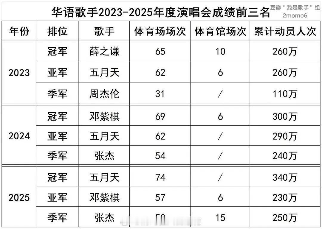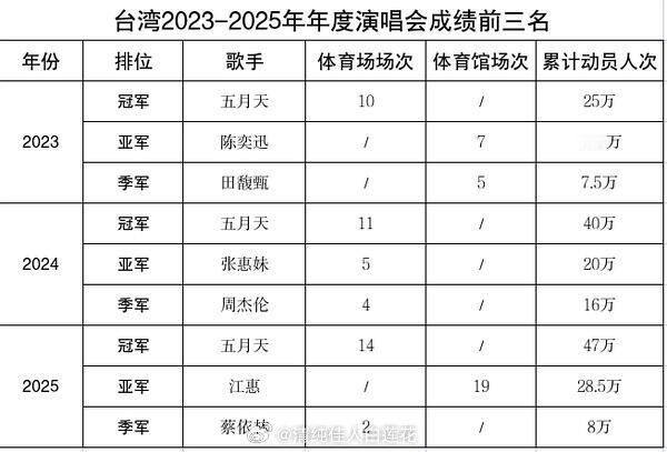 2023-2025三年的演唱会数据,成绩排名!内地累积前四:五月天,邓紫棋,张杰,薛之谦。台湾累积前三:五月天,江惠,张惠妹。香港累积前三:五月天,周杰伦,张学友。