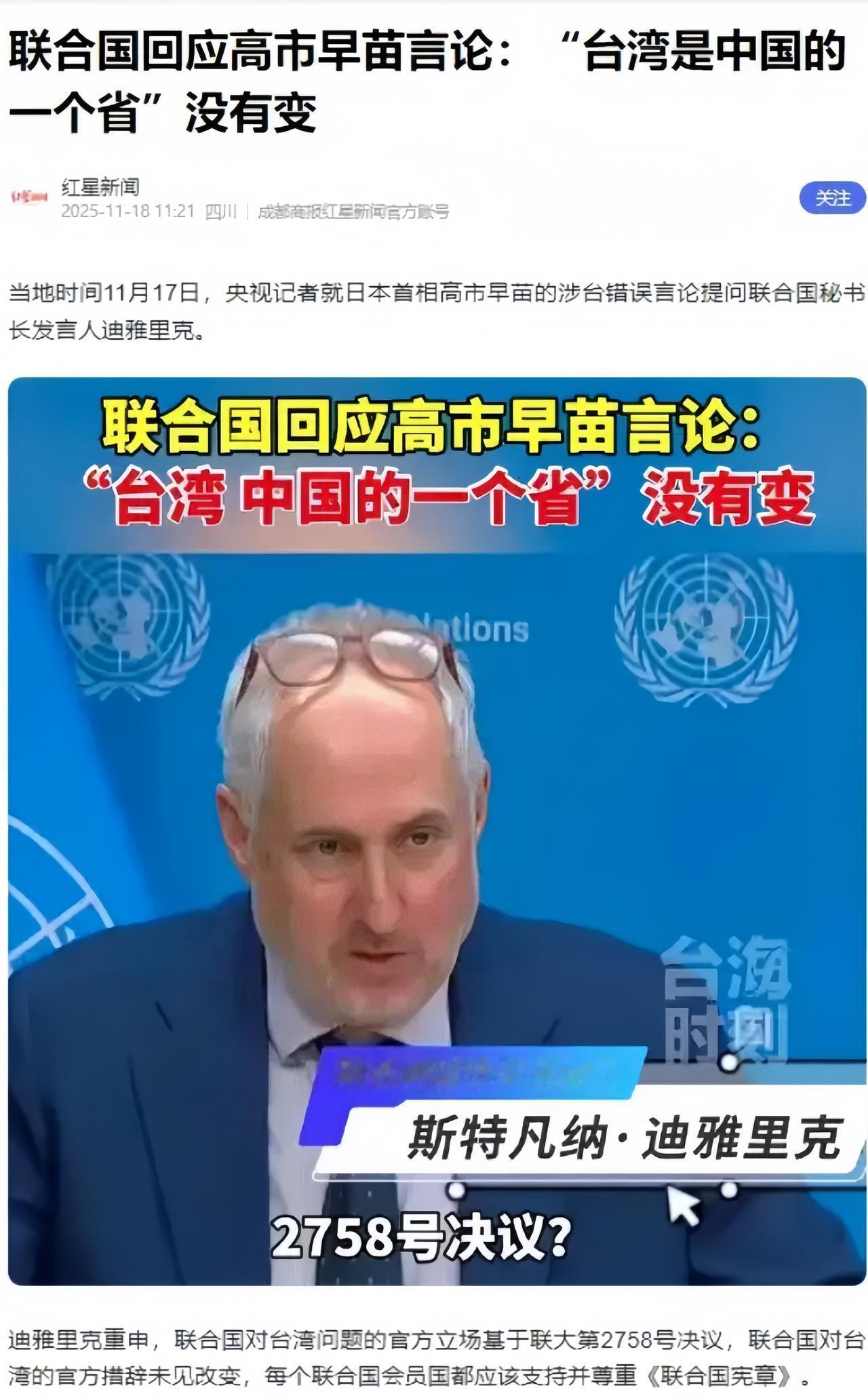 联合国发声! 日本首相被狠狠打脸了! 联合国秘书长发言人迪雅里克重申立场:世界上只有一个中国,其领土是不可分割的。 话说完,日本首相高市早苗的“某湾有事即日本有事”还敢不敢说? 高市早苗这句话,说出来的时候意气风发,仿佛已经可以率领日本出征东亚了,没想到,几天之后,就成了笑话。 高市早苗今年9月重返执政党岗位,一直忙着给自己刷存在感,保守派出身的她,从小受到日本极端保守思想的熏陶,长大后,成为日本政坛“女性新生代”的代表,一直不遗余力地推动各种右翼议题。 作为首相,她常常发表一些激进言论,试图通过煽动民族主义情绪,转移国内矛盾。 她今年3月当选为自民党政务调查会会长后,就开始频频发声,对外展现日本强国形象,对内煽动日本民众仇华情绪。 今年10月,她在东京发言时表示:“如果某湾有事,日本也有事。”这句话立刻被日本右翼媒体炒作,成为高市早苗近期活动的一大“亮点”。 没想到,这句话背后的野心,被联合国驳斥得体无完肤。这并不是日本右翼第一次被联合国打脸,今年5月,中国国务院台办发言人发表声明时,也提到“世界上只有一个中国”,并表示反对任何国家同进行官方往来和军事联系。 时隔一个月,日本当局急急忙忙派出防疫大臣去“拜会”当局,试图搞表演,没想到刚下飞机,就被中国反击得灰头土脸,只能收回脚步,匆匆结束“访台”行程。 此次日本当局又派高市早苗出访美国,企图借美方之口给自己正名,没想到美方连番表态,一次比一次狠,让高市早苗彻底丢掉了日本首相助理的脸面。 可见日本右翼想要挣脱战后体制束缚、搞军事扩张的野心,早已暴露无遗,而联合国秘书长的表态,不仅确认了中国的国际合法性,也揭穿了日本右翼的皮相和里相。 日本现在最应该做的,是收起野心,安分守己,做一个真正意义上的“和平”国家,而不是整天想着当年那一套。 联合国一句‘世界上只有一个中国’,直接戳破高市早苗的政治投机——所谓‘台湾有事即日本有事’,既违背法理,又暴露扩张野心。 她背后就是日本右翼想搞军事扩张,拿台海问题当筹码,既想转移国内矛盾,又想挣脱战后束缚,这种挑衅既改变不了中国统一的趋势,还会让日本更孤立。 说白了,不管谁想分裂别人领土、挑战国际秩序,都是自讨没趣,最后准得栽跟头,咱就该看清这一点,坚决站在正义和法理这边! 你觉得日本右翼的野心能得逞吗?某湾统一的进程谁也挡不住,评论区说说你的观点!
