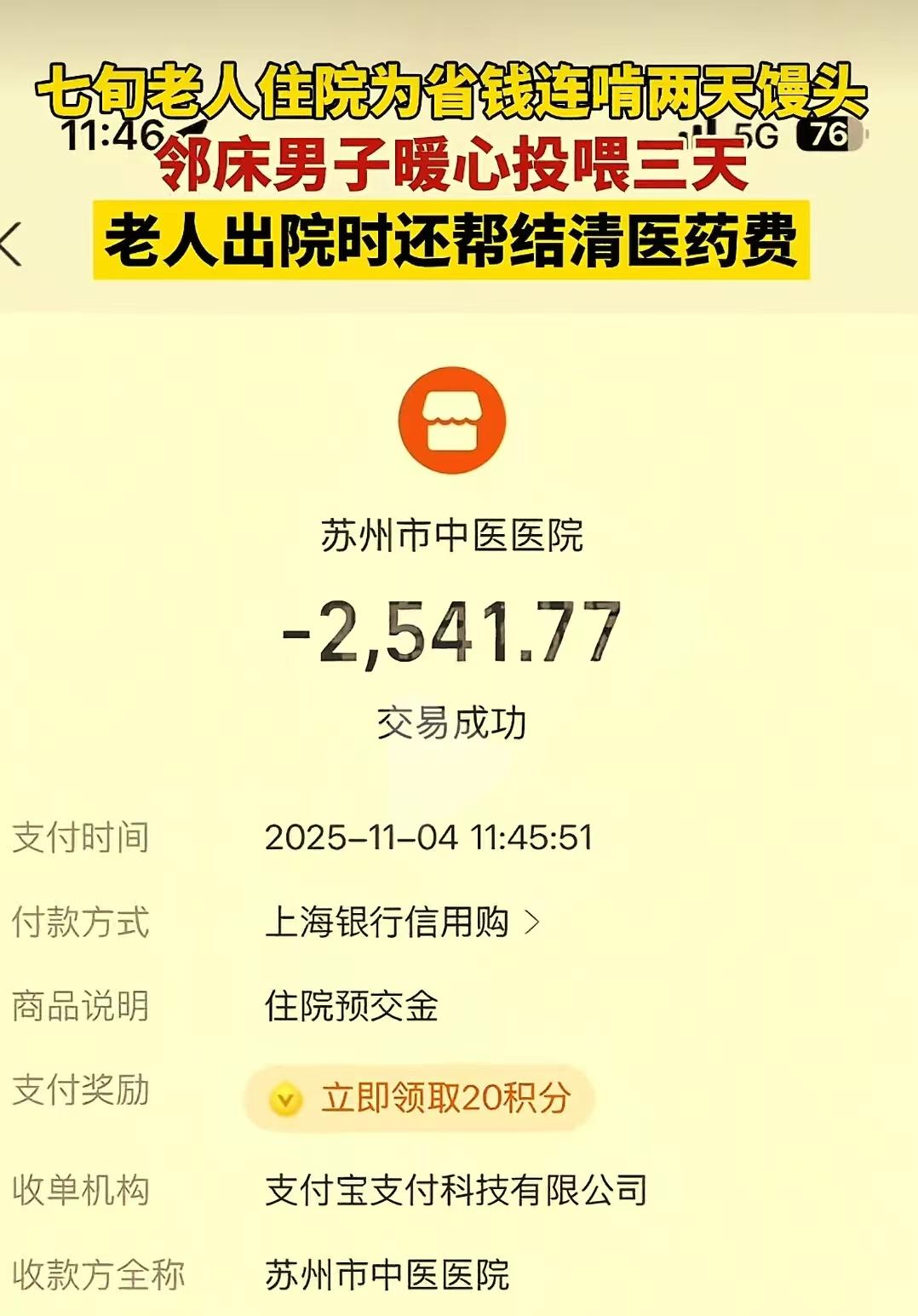 江苏苏州,七旬老人住院,为了省钱,连啃两天馒头!邻床小伙看到后,心里满是同情。于是多点了一份外卖,谎称外卖送多了。而接下来小伙的做法, 让老人哽咽流泪!网友:给老人买几顿饭我做的到,但是给老人结清医药费, 我是绝对做不到! 小伙生病住院,他注意到旁边病床上的老爷爷没人照料,到了饭点只吃白馒头。 一开始,小伙没太在意。可到了第二天中午,他发现老爷爷依旧啃着馒头,这才意识到老爷爷可能经济条件不太好。 这时,医生来查房,询问老爷爷吃了什么。老爷爷无奈地回答说吃的是馒头。 医生皱着眉头说:“这样可不行啊,得好好吃饭才行!” 老爷爷叹了口气,说道:“唉,家里都没钱了,哪还顾得上吃饭,就啃两个馒头顶顶饿吧。” 小伙听到这番话,同情心一下子就被激发出来了。正好他自己也要点外卖,便多订了一份。 但他又担心直接把饭给老爷爷,老人会不好意思接受。于是,外卖到了后,他笑着对老爷爷说:“老爷爷,来一起吃,这外卖送错了,多送了一份呢!” 老爷爷先是愣了一下,然后婉拒道:“我吃不下。” 小伙劝说道:“您就只吃了两个馒头,怎么会吃不下呢?快来吃吧,不吃扔了怪可惜的。” 在小伙的劝说下,老爷爷这才拿起了筷子。 老爷爷嘴上说着不饿,可手却很诚实地快速吃了起来,看得出他是真的饿坏了。 后来,小伙和老爷爷渐渐熟悉起来,每顿饭都会给老爷爷点外卖。 这次住院一共五天时间,小伙给老爷爷点了三天的外卖。 到了第五天,老爷爷准备出院去结算医药费,却被告知费用已经结清了。 老爷爷十分震惊,赶忙问护士是不是弄错了,说自己在这边也没亲人帮忙结账啊。 护士指了指旁边的小伙子,说道:“是他帮您结的,您好好谢谢他吧。” 那一刻,老爷爷的眼眶瞬间红了,他紧紧抓着小伙子的手,连说了好几次谢谢才不舍地离开。 很多人在面对别人的困境时,总是找各种借口退缩,就像网友说的,给老人买几顿饭或许还能做到,但结清医药费就觉得难以企及。 其实,这不仅仅是钱的问题,更是人性中善良和担当的缺失。我们总在抱怨社会冷漠,却忘了自己也可以成为那束温暖他人的光。 这个小伙就像冬日里的暖阳,用自己的善良和行动温暖了老人冰冷的心。他没有因为自身也在生病而忽视他人的苦难,而是毫不犹豫地伸出援手。 他的每一次外卖、每一句劝说,都充满了真诚和善意。他用实际行动告诉我们,善良不分大小,爱心不论多少,在别人最需要的时候拉一把,就能让这个世界变得更加美好!