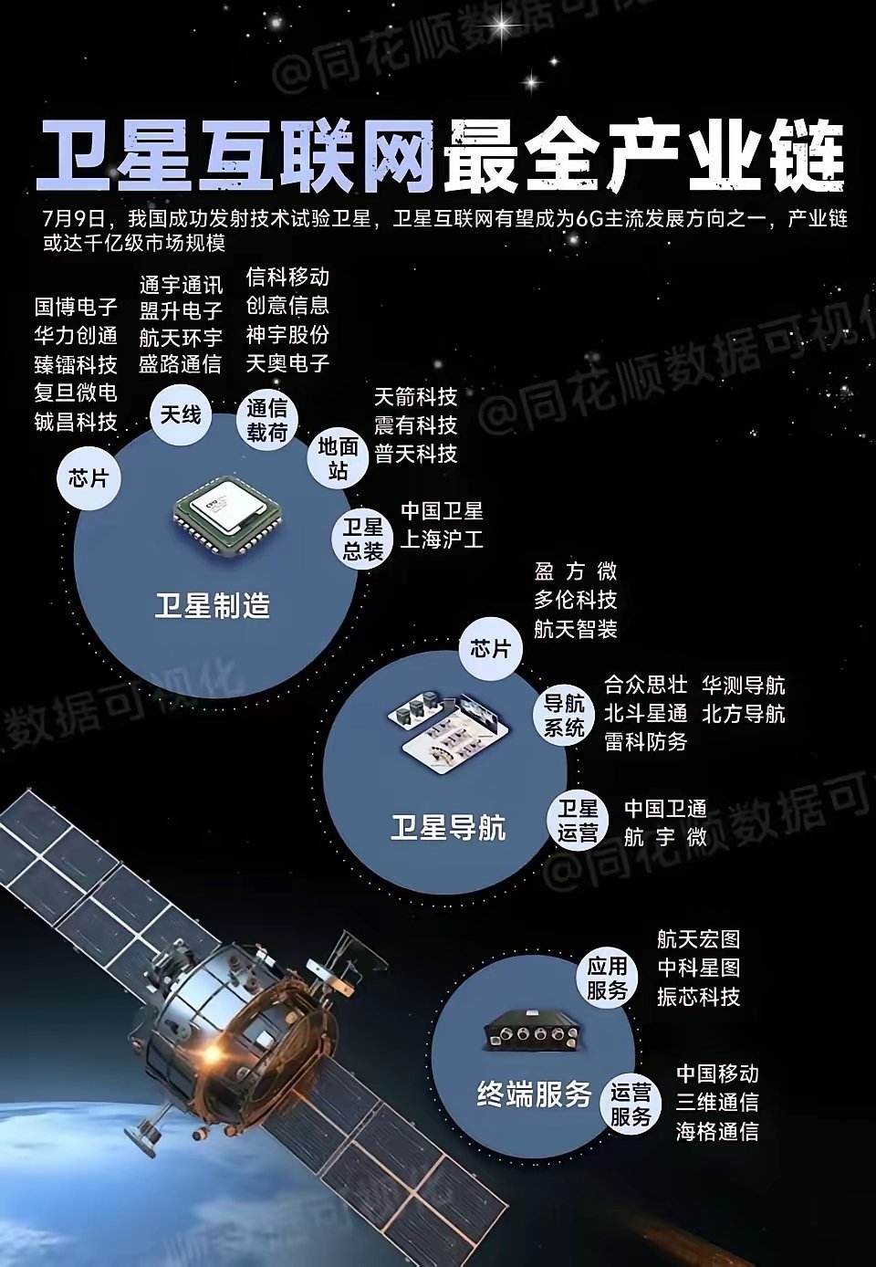 卫星互联网牌照受益梯队一、第一梯队:牌照最有可能直接获得者(确定性最高)1、中国卫通(601698):中国航天科技集团控股,唯一的商业卫星通信运营商。拥有通信卫星在轨资源、频率、地面站,具备完整运营资质。极大概率成为首批牌照获得者。2、中国电信(601728):拥有“天通一号”卫星移动通信系统。与中国卫通深度合作,国家级“天地一体化”通信战略执行者之一。二、第二梯队:可能性较大(合作/部分牌照)1、中国移动(600941):积极参与卫星互联网建设,与航天科技、航天科工有合作。可能通过与卫通合作或联合申请进入。2、中国联通(600050):近年来布局“天地一体化网络”,与北斗、低轨卫星项目有对接。有可能拿到部分业务试点牌照。三、第三梯队:产业链配套与应用(受益于建设和应用扩展)1、卫星制造 & 发射:航天电子(600879)、航天电器(002025)、中航光电(002179)提供卫星核心电子设备、连接器、动力系统。2、卫星测控 & 应用:航天宏图(688066)(遥感卫星大数据应用)、星网宇达(002829)(卫星导航、惯性导航产品)。北斗星通(002151)、华力创通(300045)(卫星导航芯片、卫星通信终端)。3、终端与应用场景:海格通信(002465):军用与民用卫星通信终端设备。国科微(300672):卫星互联网芯片。盛路通信(002446):卫星通信天线。四、总结1、第一梯队(最大确定性):中国卫通、中国电信2、第二梯队(大概率参与):中国移动、中国联通3、第三梯队(产业链扩散受益):航天系+北斗系+通信终端厂商五、投资逻辑1、确定性龙头(政策受益):中国卫通2、边际提升(运营商):三大电信3、弹性标的(产业链):航天电子、北斗星通、海格通信等